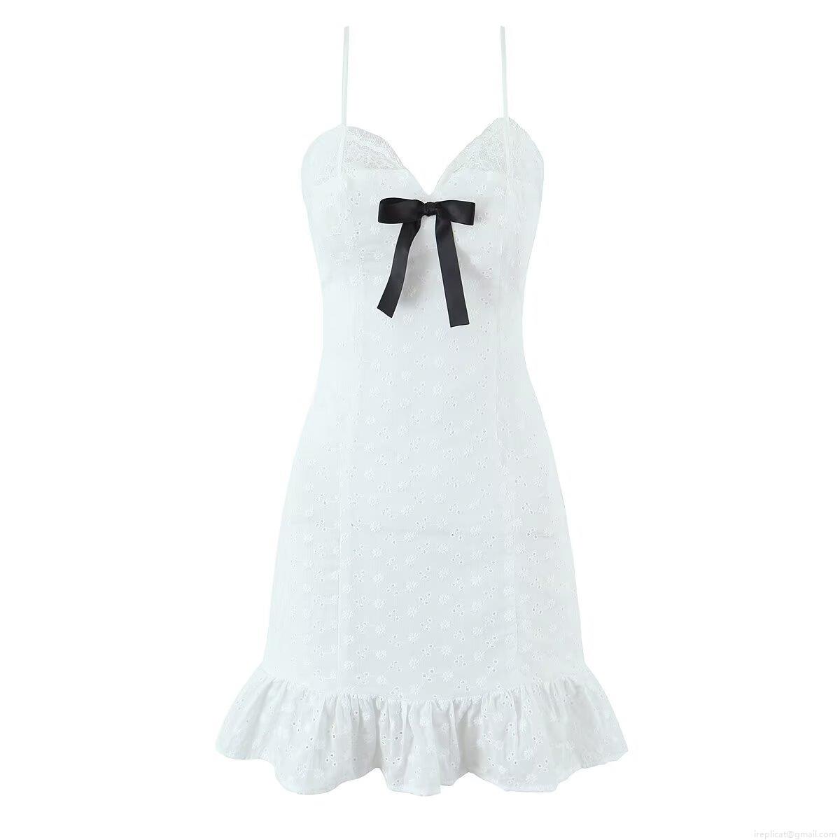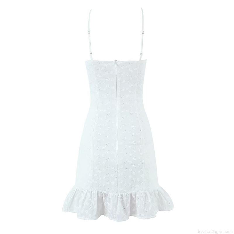 • Women White Cotton Eyelet Embroidery Sling Mini Dress Lace Patchwork Bow Detail V-Neck Backless Ruffle Sexy Sweet Party Dress