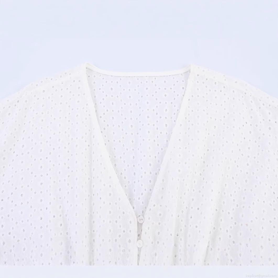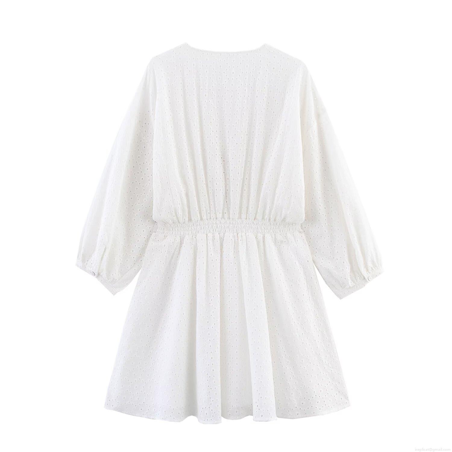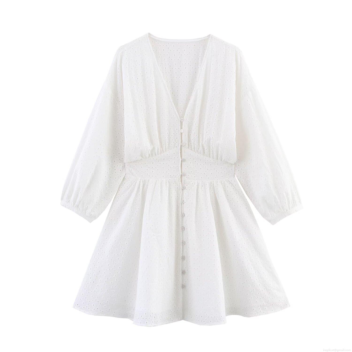 • Women White Eyelet Embroidery Long Sleeve V Neck Mini Dress Hollow Out Button Down A-Line Street Style Summer Short Dress For Vacation Party