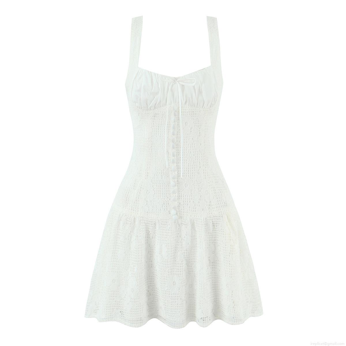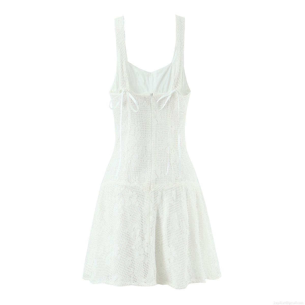Women White Lace Mini Dress With Bow Tie Strap Sleeveless V Neck Back Zipper A-Line Party Sundress For Ladies Sexy Sweet Lolita Style Summer Dress