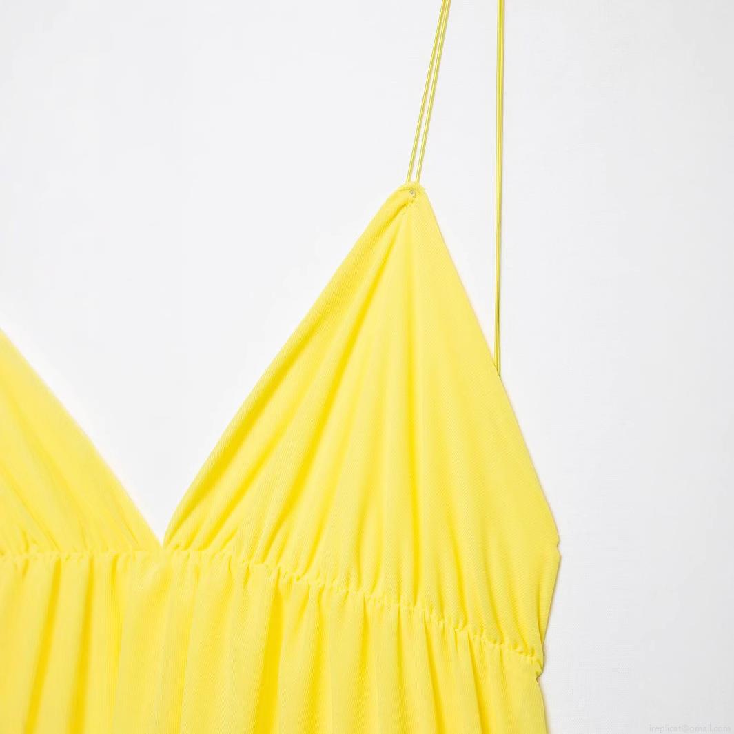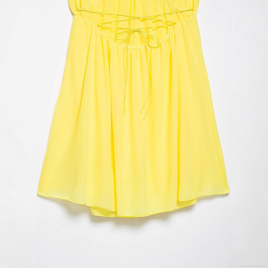 • Women Yellow Backless Cross Tie Mini Dress Polyester Pleated V Neck Sleeveless A-Line Cami Sexy Summer Party Club Streetwear Dress
