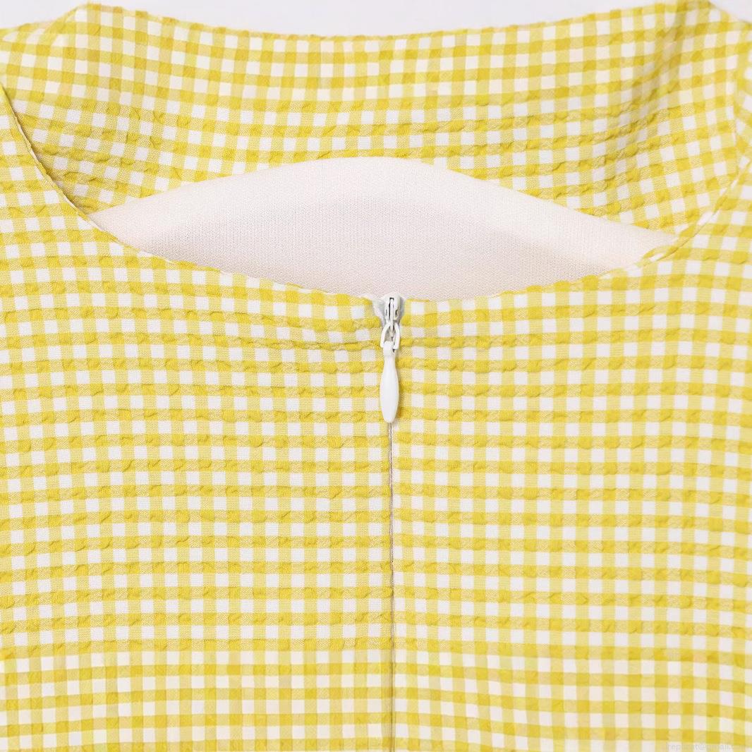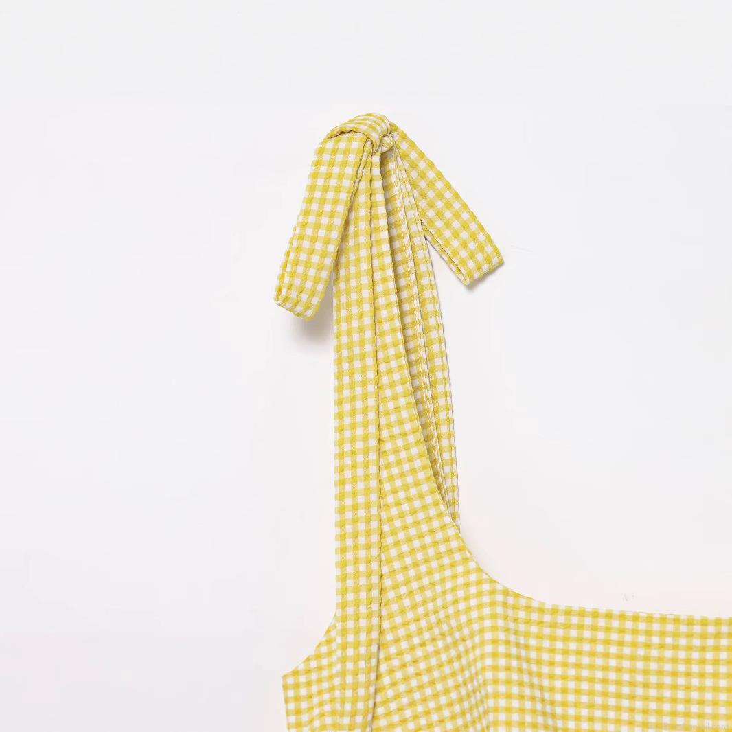 • Women Yellow White Gingham Plaid Mini Dress Square Neck Bow Tie Shoulder Sleeveless Seersucker Bodycon Cami Dress Summer Casual Streetwear