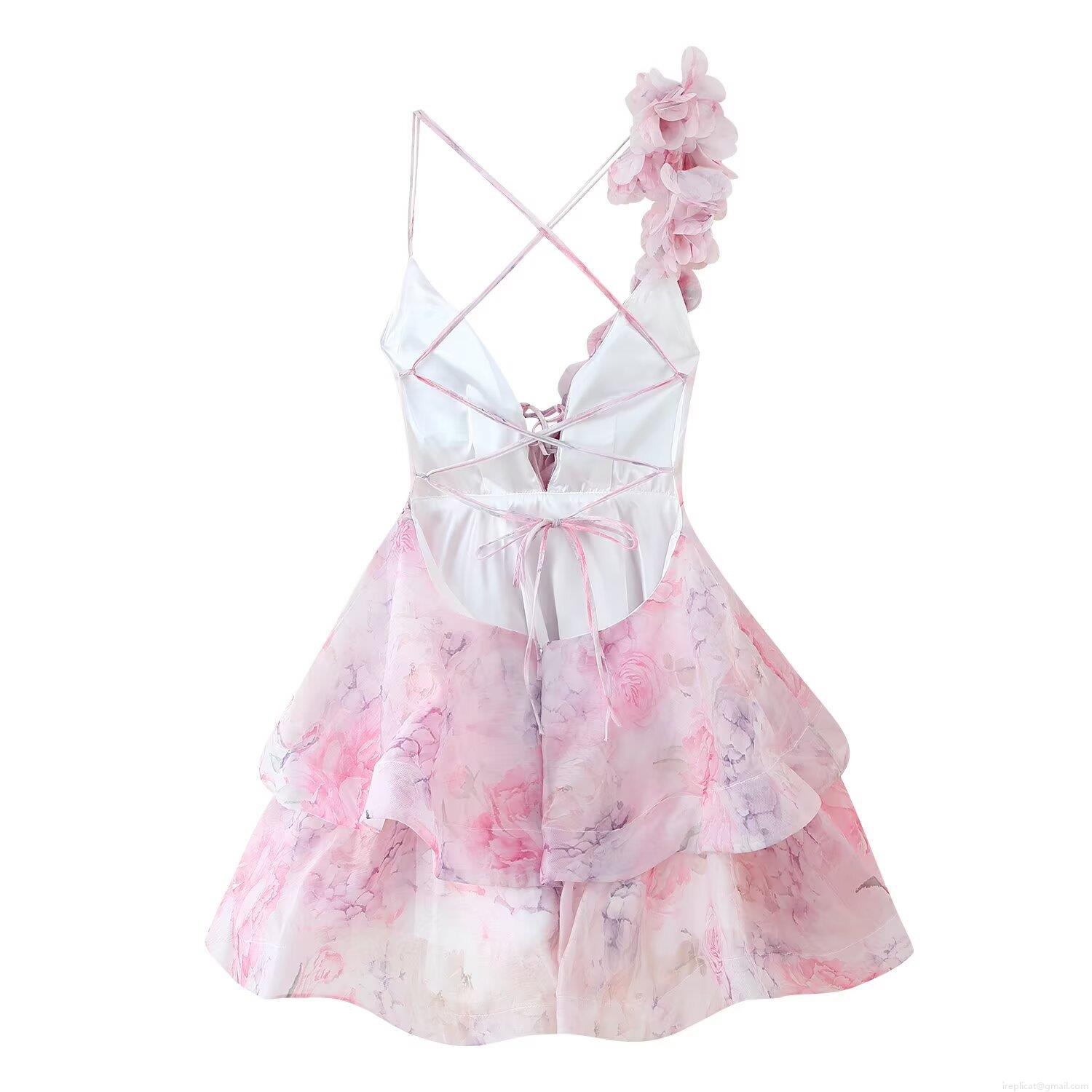 • Women's 3D Fabric Flower V-Neck Backless Cami Dress Chiffon Multi-Layer Ruffle Sexy Mini Dress For Summer Vacation Party Sweet Floral Print Sleeveless Sundress
