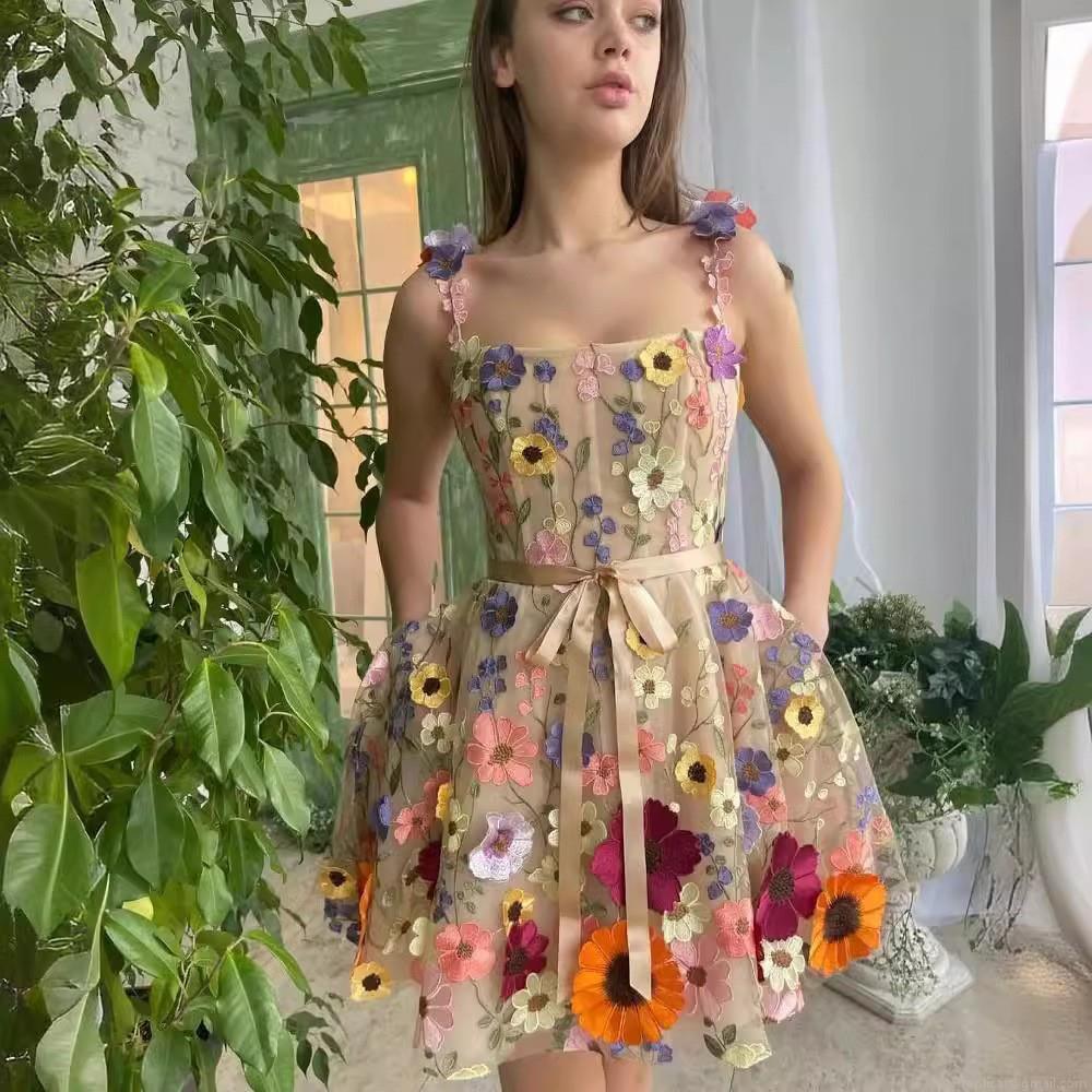 • Women's 3D Floral Embroidery Mesh Mini Dress Polyester Sleeveless Spaghetti Strap Party Dress With Satin Ribbon Belt Sexy Bodycon Clubwear