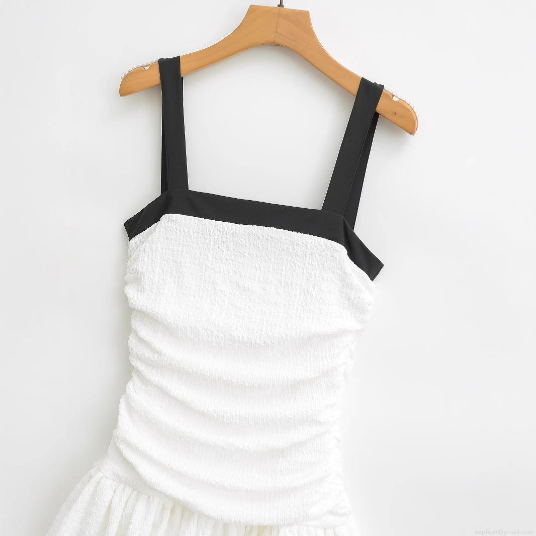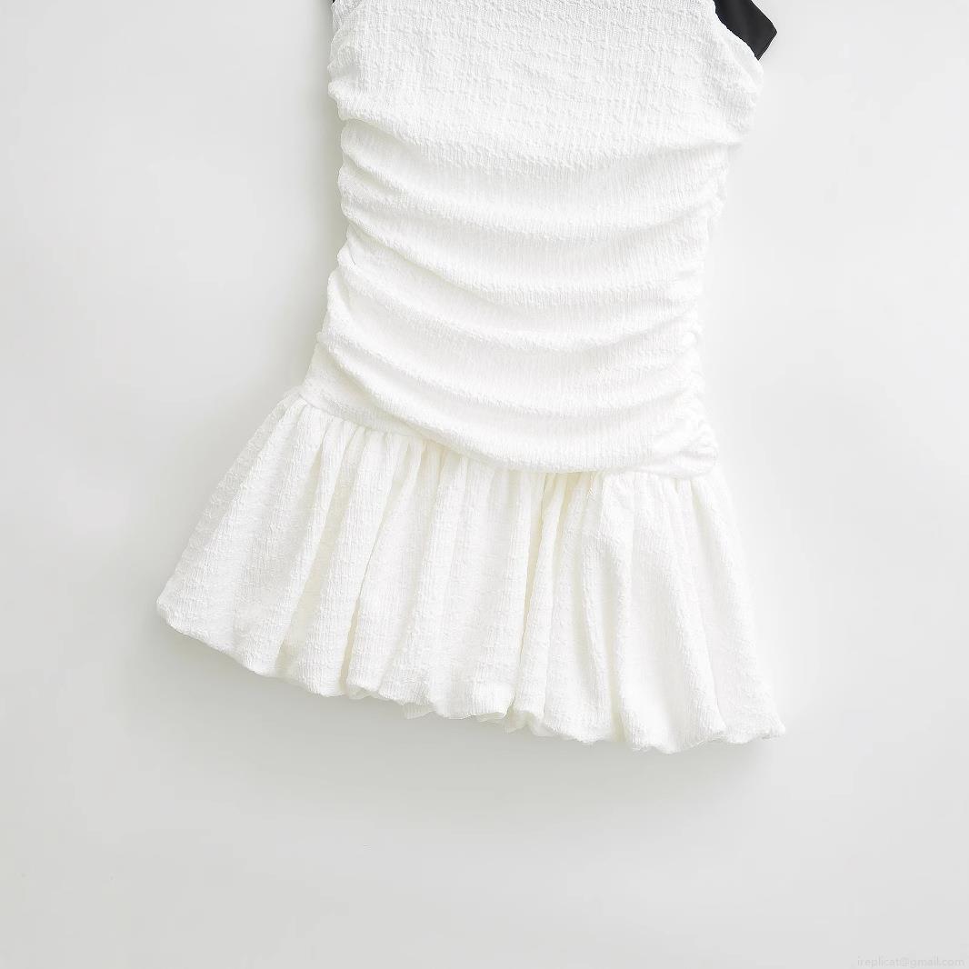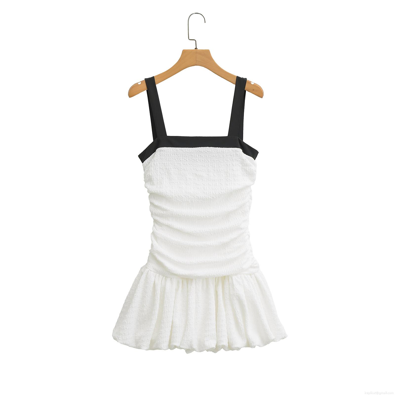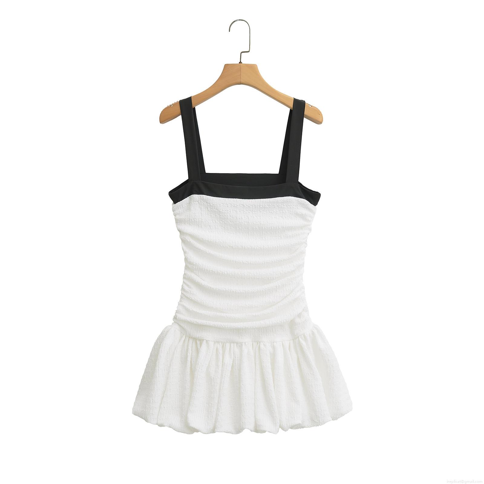 • Women's Black and White Contrast Cami Balloon Dress Elegant Textured Pleated Sleeveless Mini Dress for Party Socialite Summer