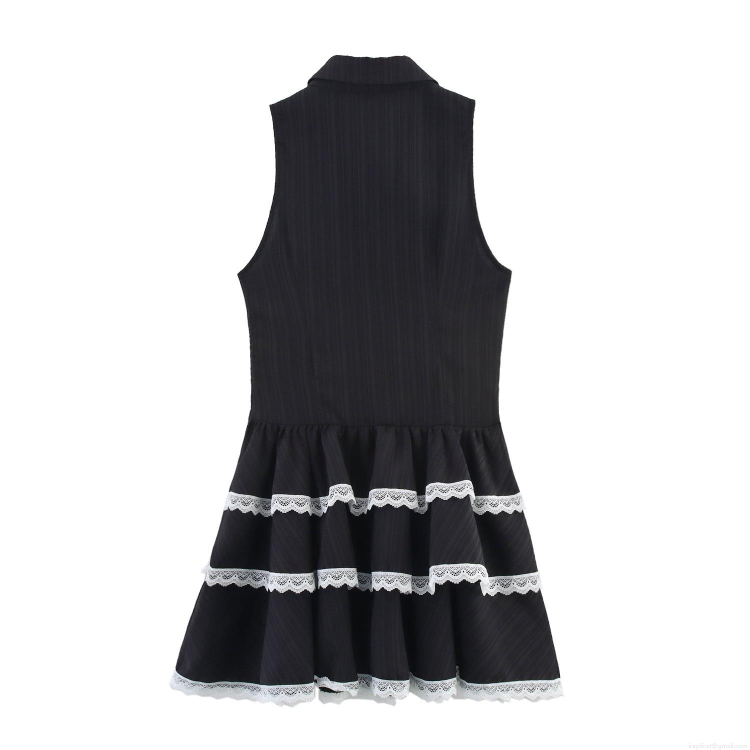 Women's Black Sleeveless Mini Dress Contrast White Lace Trim Layered Cake Skirt Ribbed Fabric Polo Collar Gothic Preppy Style Party Dress