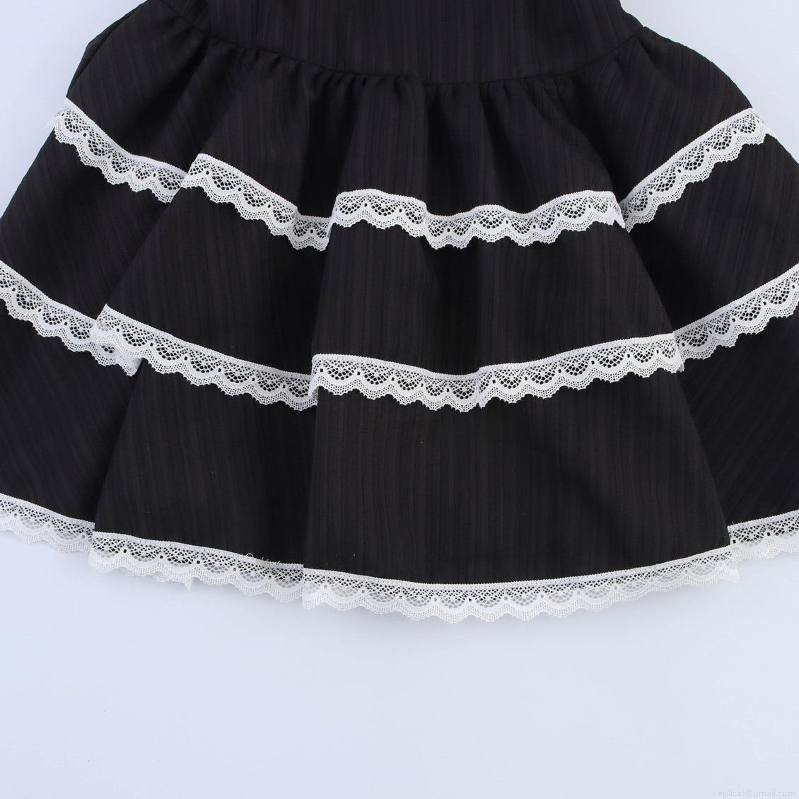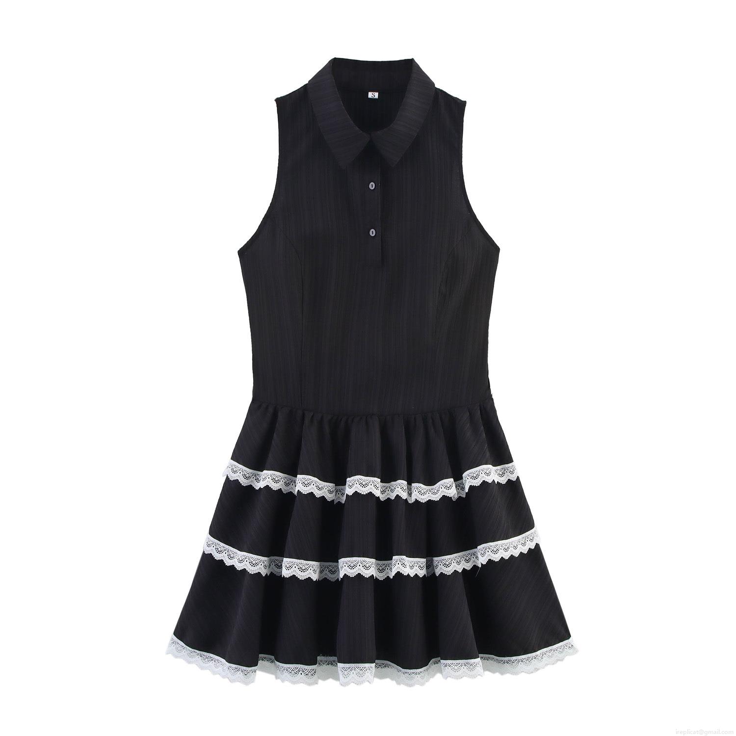 • Women's Black Sleeveless Mini Dress Contrast White Lace Trim Layered Cake Skirt Ribbed Fabric Polo Collar Gothic Preppy Style Party Dress