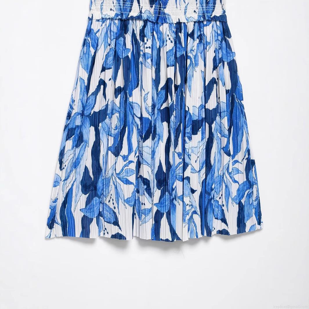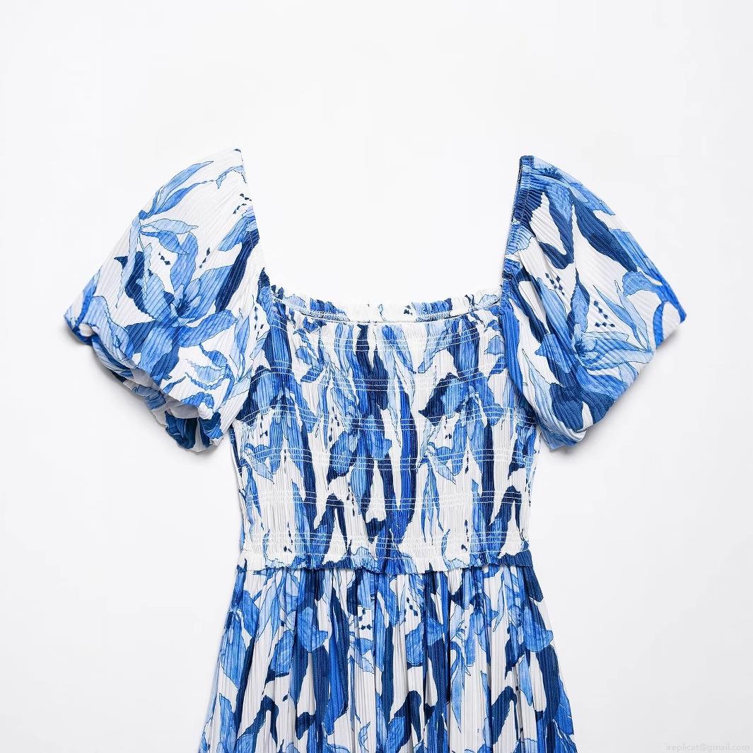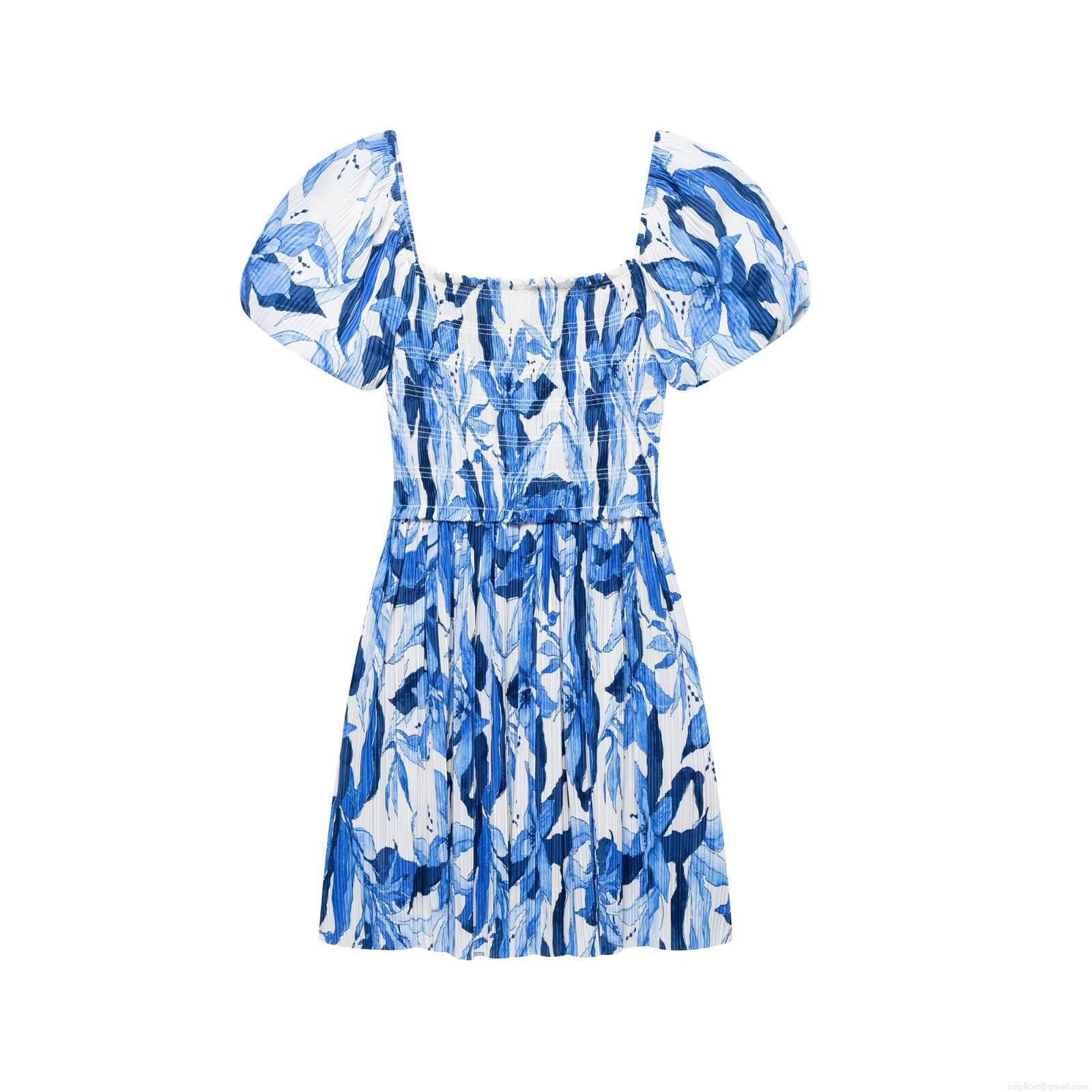 • Women's Blue and White Floral Print Smocked Mini Dress Puff Sleeve Square Neck Pleated Polyester Dresses For Summer Vacation Casual Elegant Lady