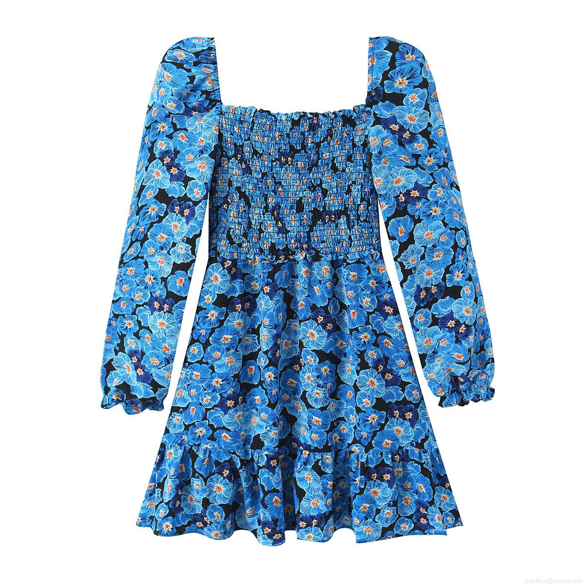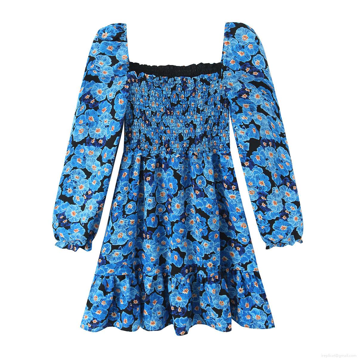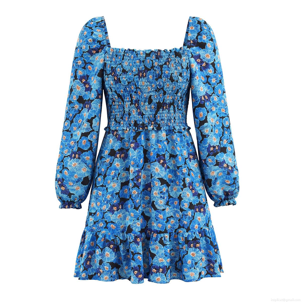 • Women's Blue Floral Print Mini Dress Square Neck Smocked Elastic Waist Long Puff Sleeve Layered Ruffle Hem Polyester Summer Dress For Women