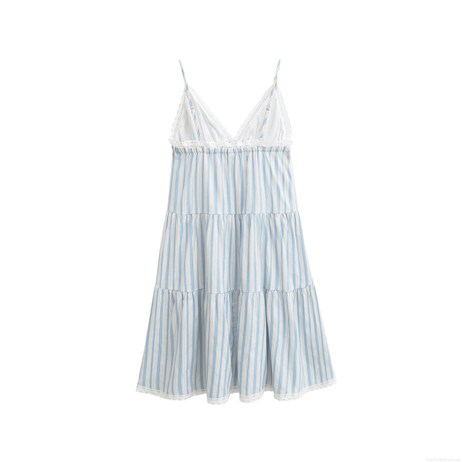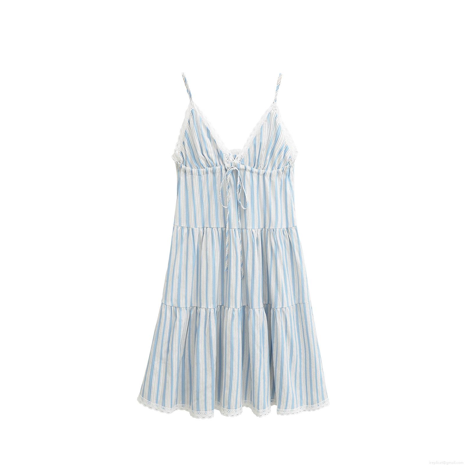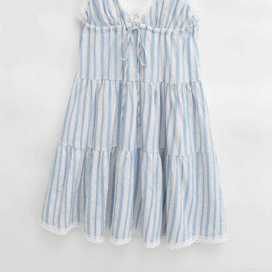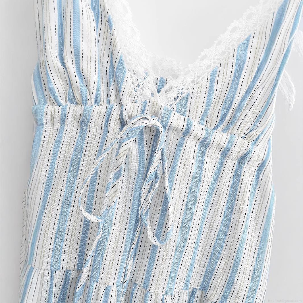 • Women's Blue White Striped Spaghetti Strap Mini Dress V Neck Lace Tiered Ruffle Hem A-Line Cami Cotton Sun Dress For Summer Beach Vacation Party