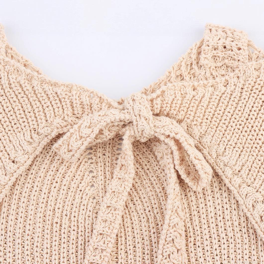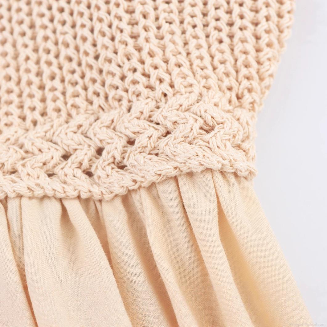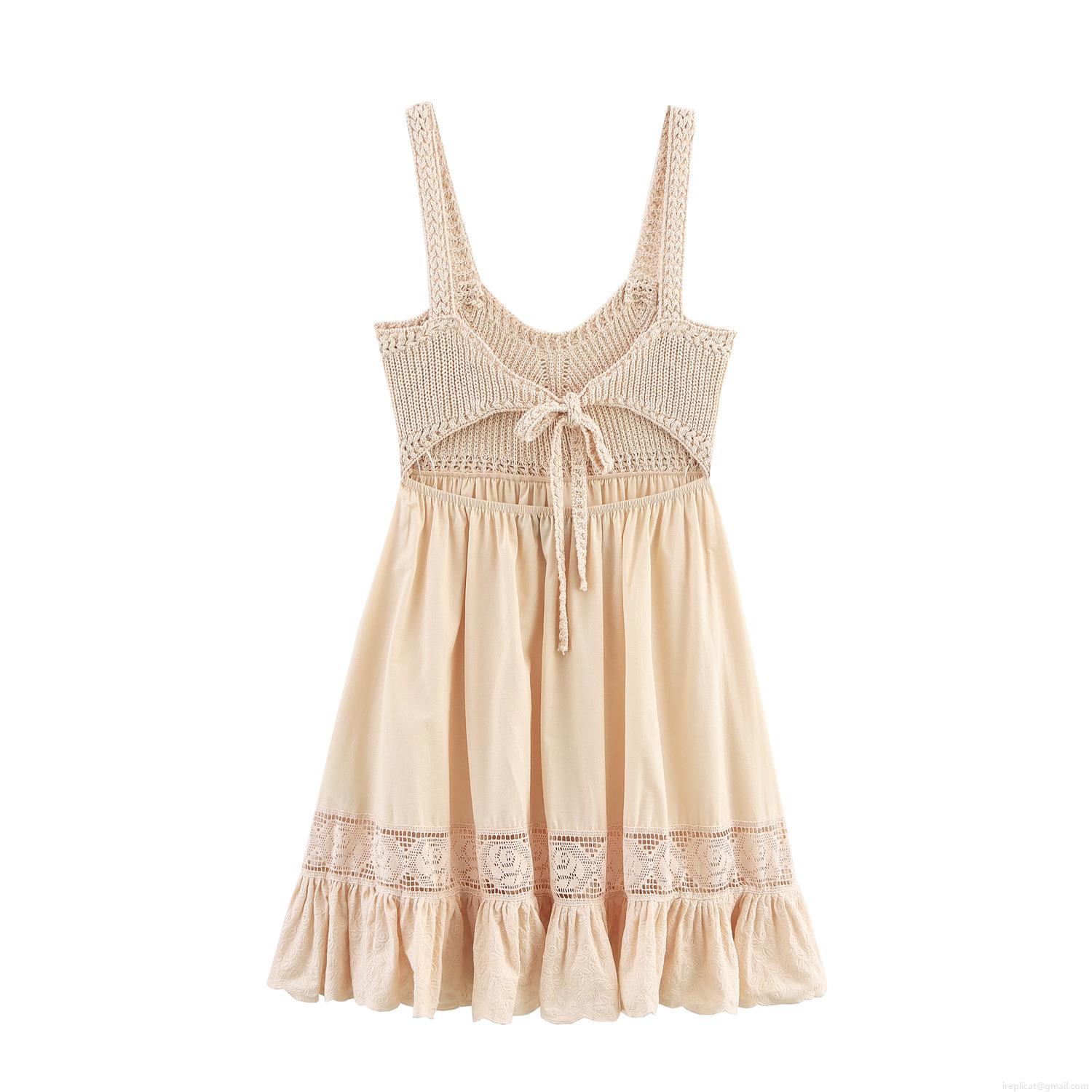 • Women's Bohemian Crochet Knit Patchwork Camisole Dress Backless Lace-up V-neck Mini Dress With Lace Trim Beige Sleeveless Dress For Summer Beach Vacation Party