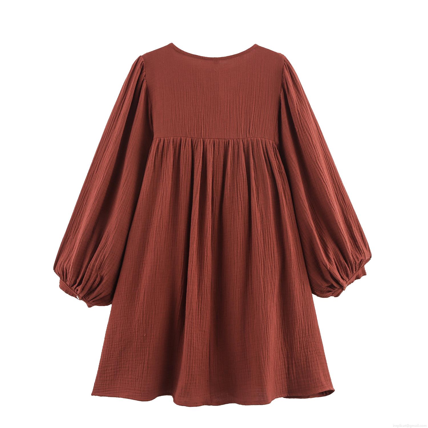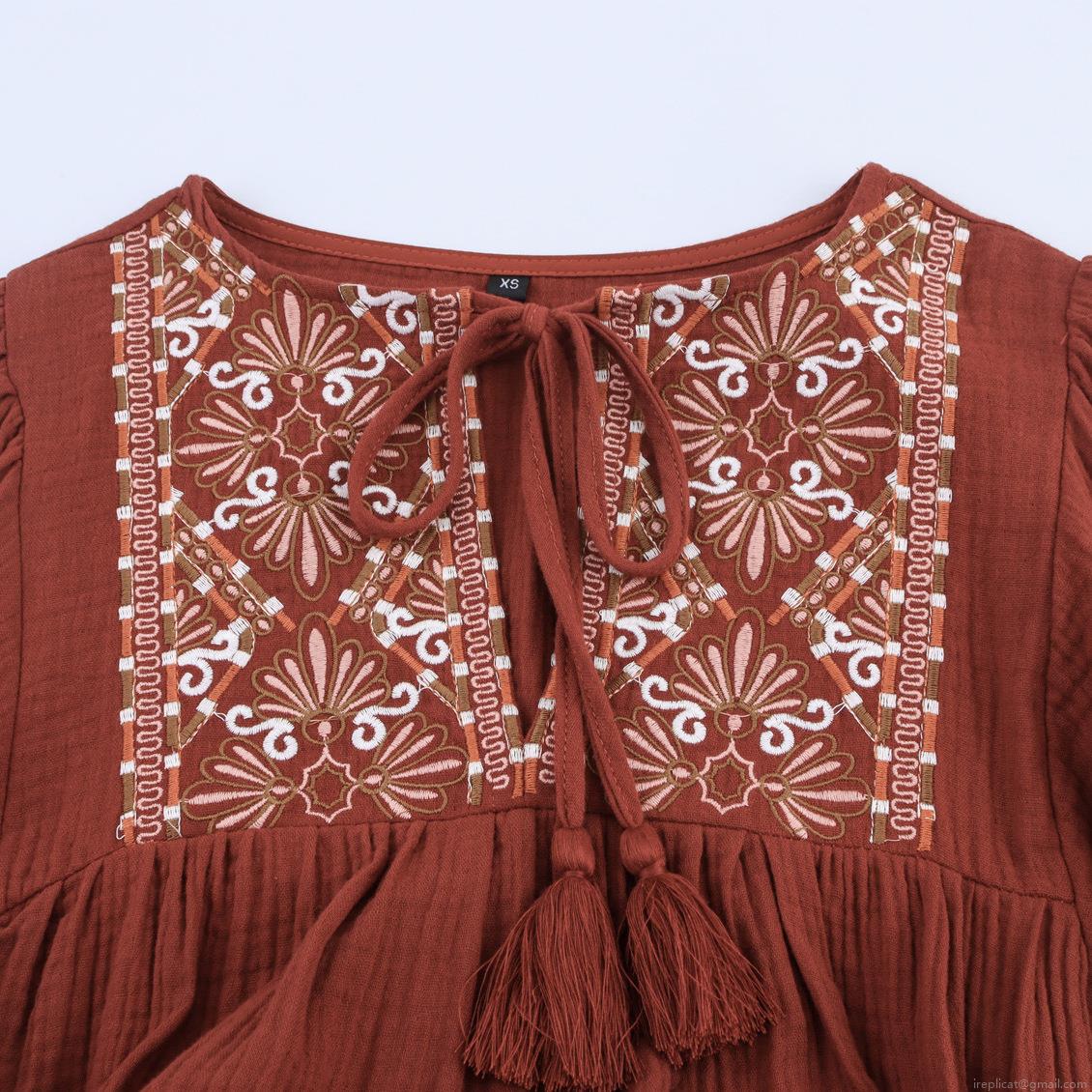 • Women's Bohemian Embroidered Mini Dress Cotton Blend Lantern Sleeve Tassel V-Neck Ethnic Style Casual Vacation Short Dress Rust Red
