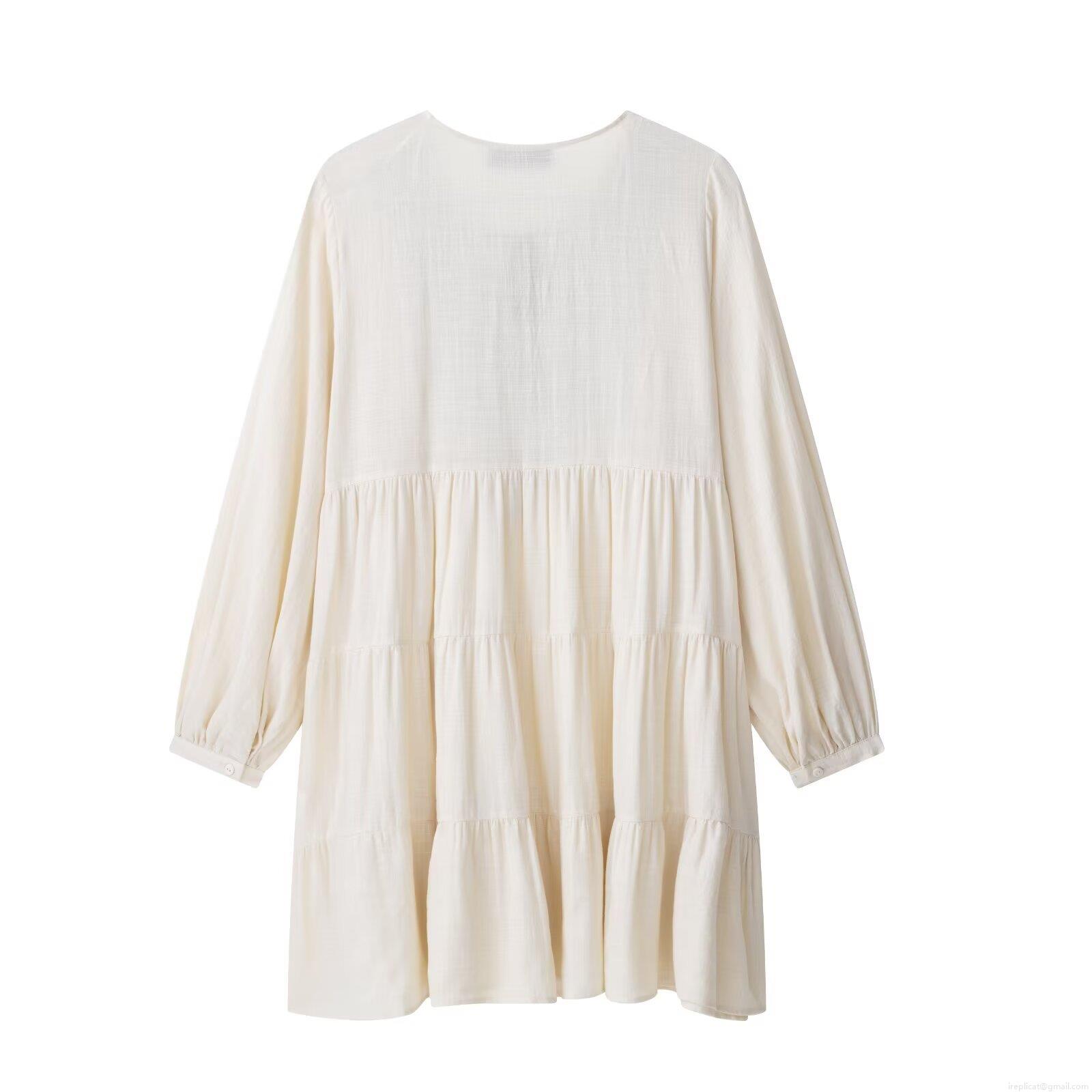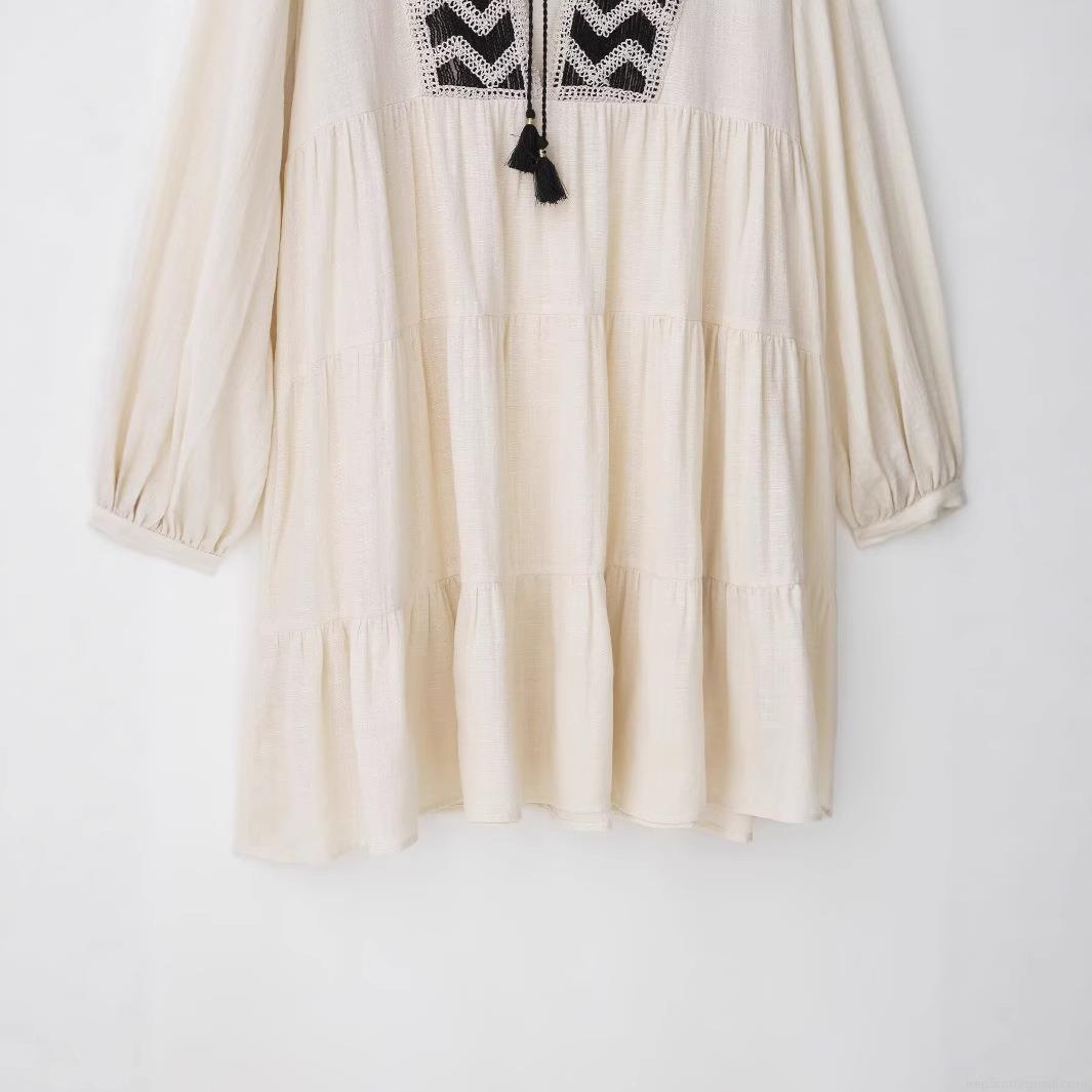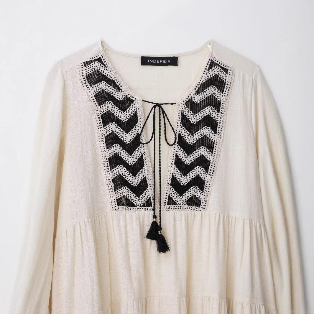 • Women's Bohemian Embroidered Mini Dress V-Neck Cotton Linen Blend Long Sleeve Tiered Cake Skirt With Tassel Ties Summer Beach Vacation Daily Fashion