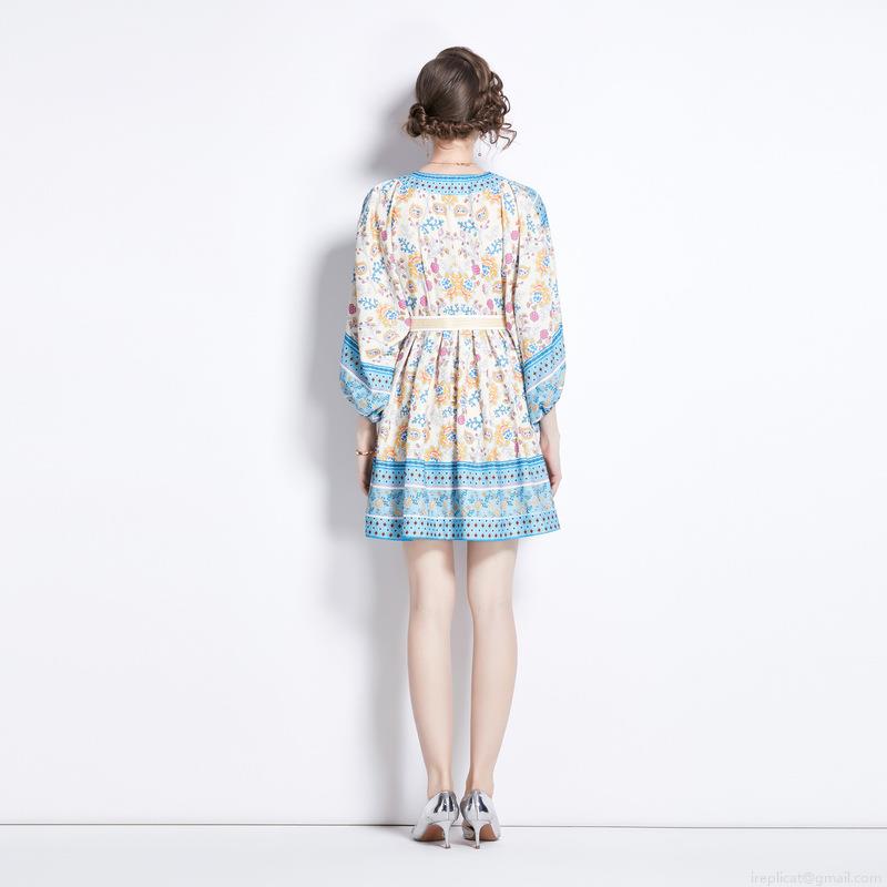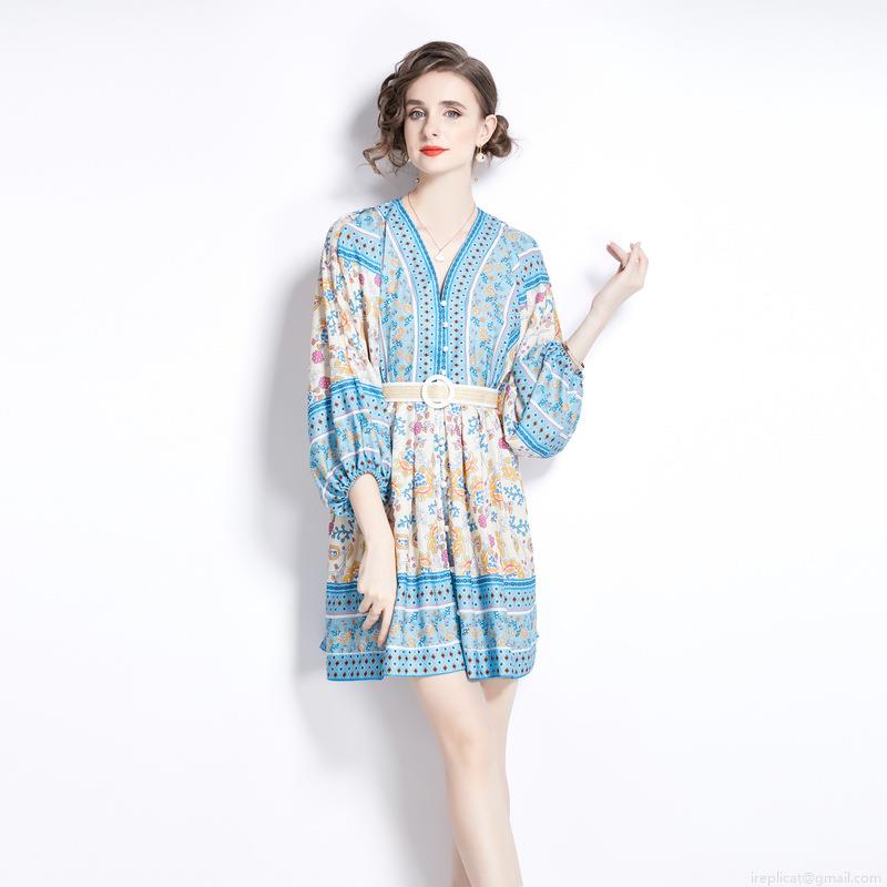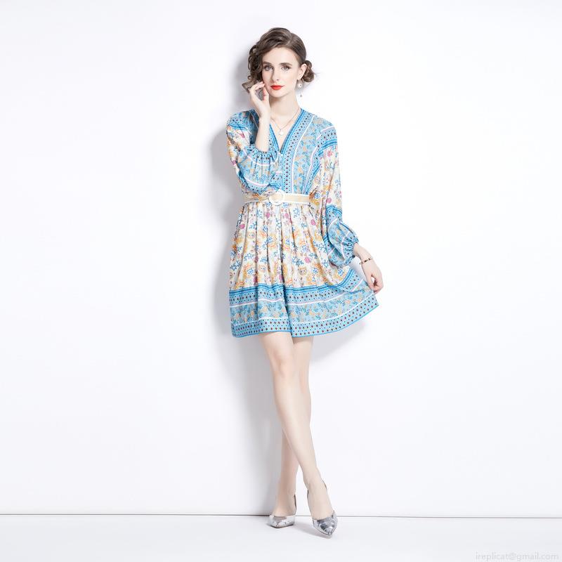 • Women's Bohemian Floral Print V-Neck Long Lantern Sleeve Dress With Braided Belt Elegant Ethnic Vacation Short A-Line Pullover Mini Dress