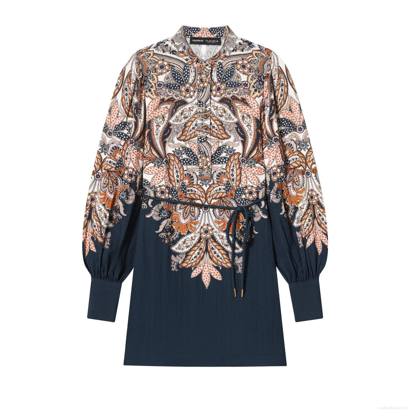 • Women's Bohemian Paisley Print Long Sleeve Mini Dress Elegant Stand Collar Drawstring Waist Navy Blue Polyester Dress For Party Vacation Women