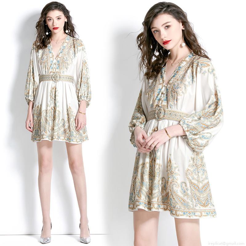 • Women's Bohemian Print Mini Dress Chiffon V Neck Lantern Sleeve Belted Short Dress For Vacation Party Elegant Retro A-Line Dresses