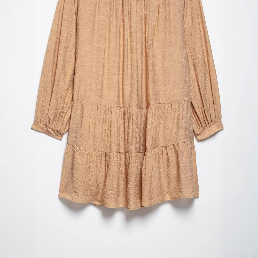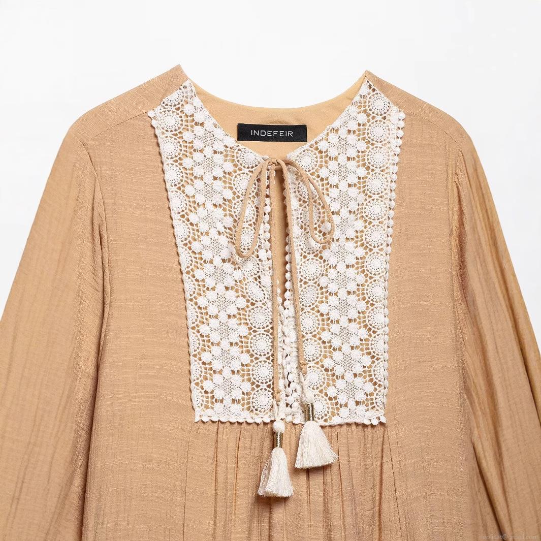 • Women's Bohemian Tiered Mini Dress With Lace Crochet Tassel Tie Neck Long Sleeve Textured Solid Color Casual Elegant Dress For Women