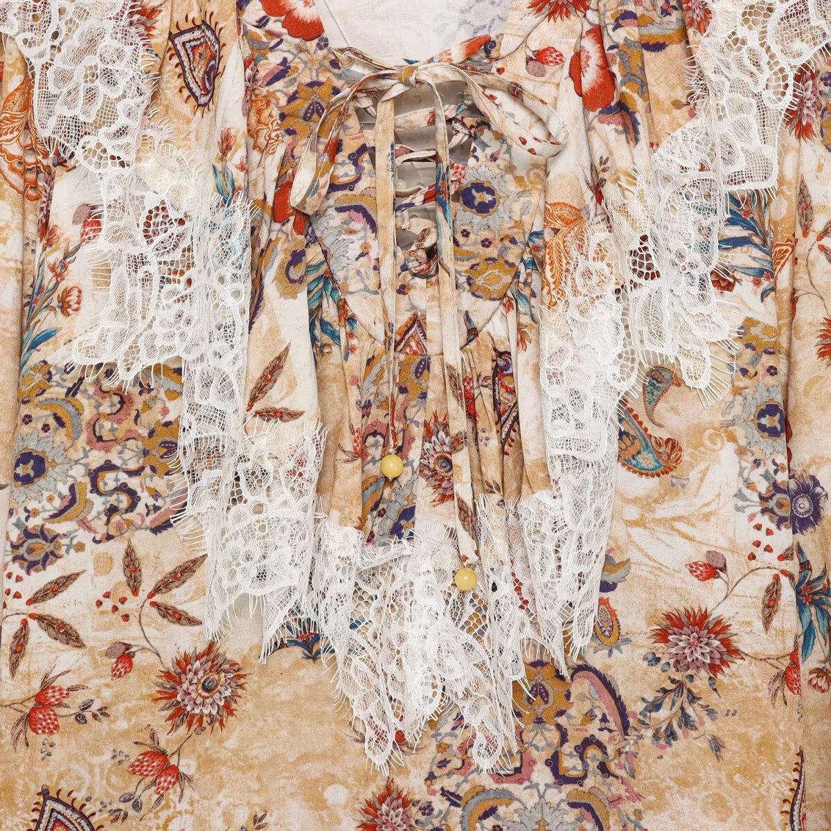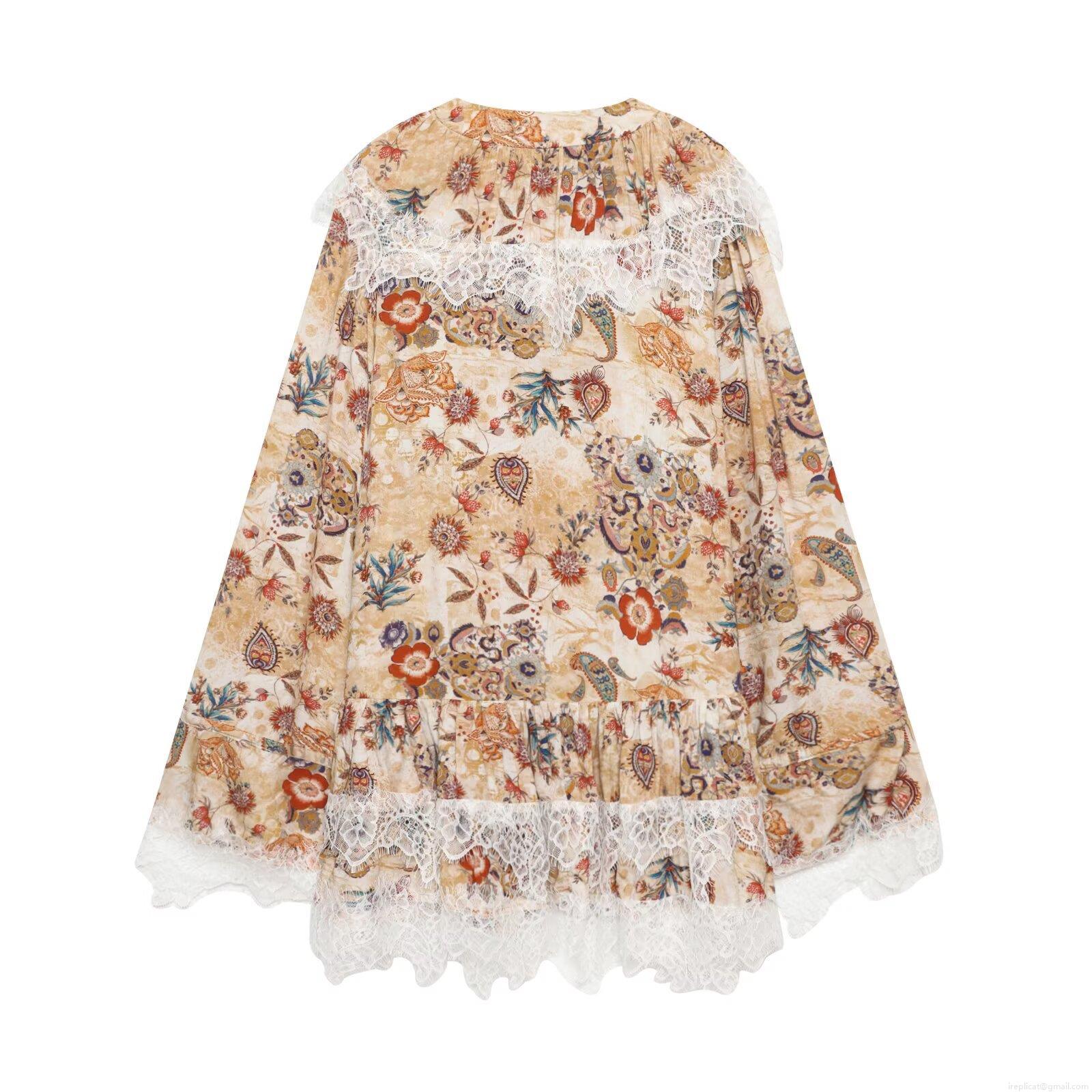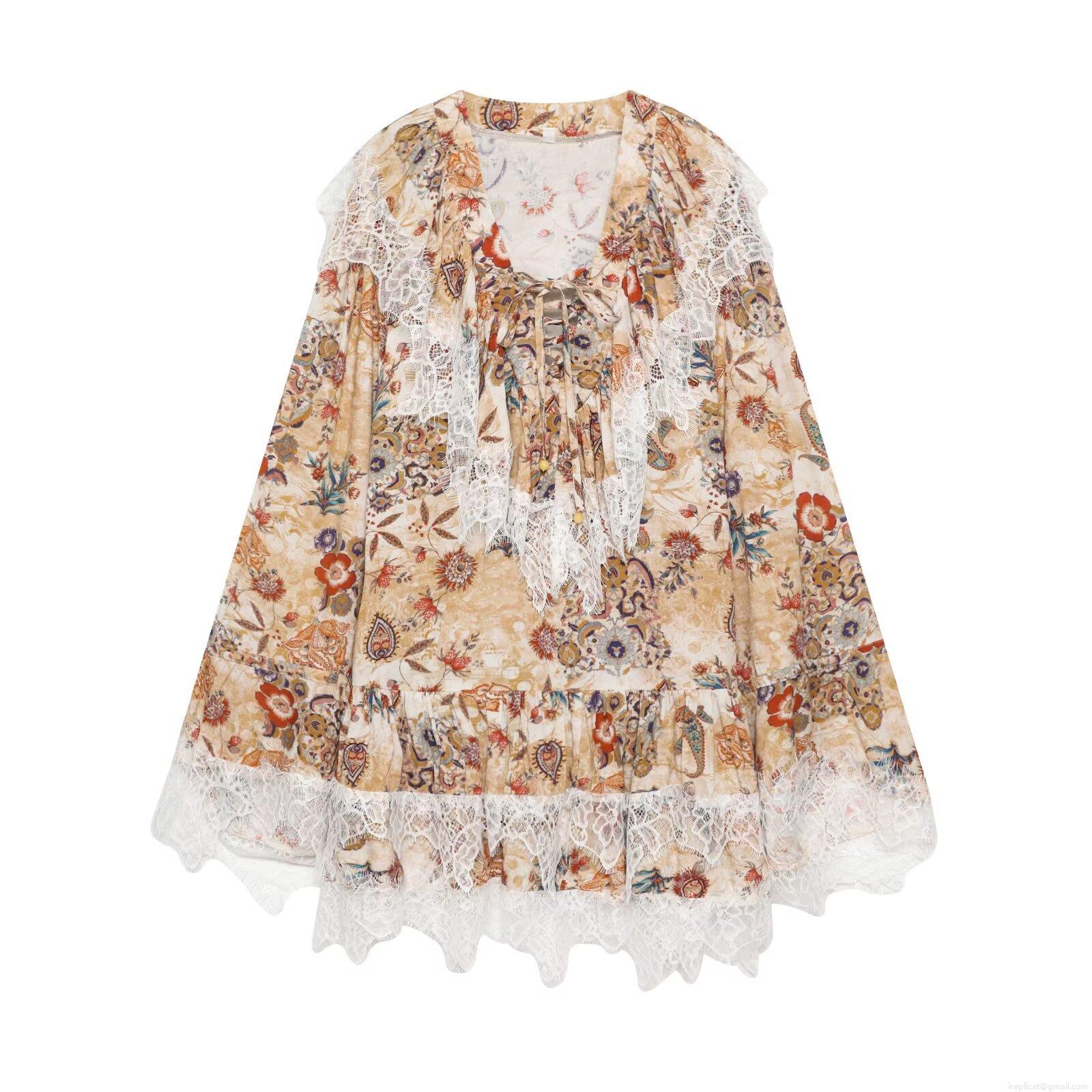 • Women's Bohemian V Neck Mini Dress Rayon Lace Trim Loose Fit Long Sleeve Tie Front Vintage Floral Paisley Print Vacation Beach Party Dress