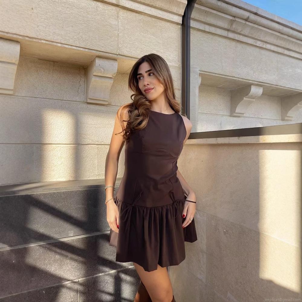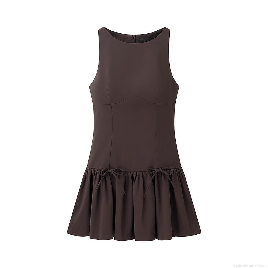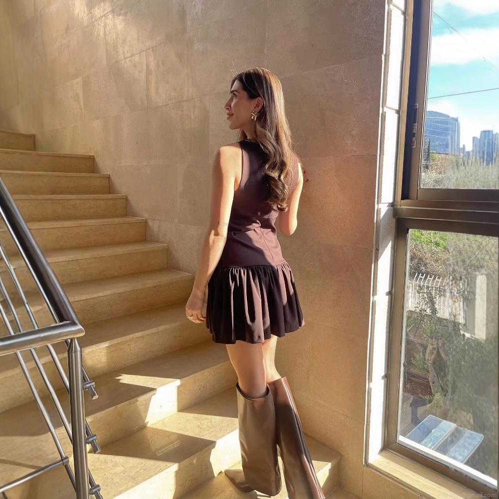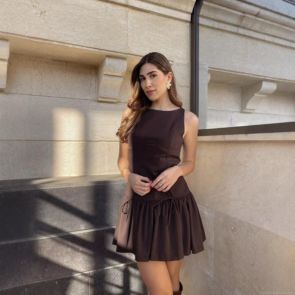 • Women's Casual Sleeveless Polyester Bow Ruffle Mini Dress Preppy Style High Waist Coffee Brown Round Neck A-Line Dress For Daily School Dating