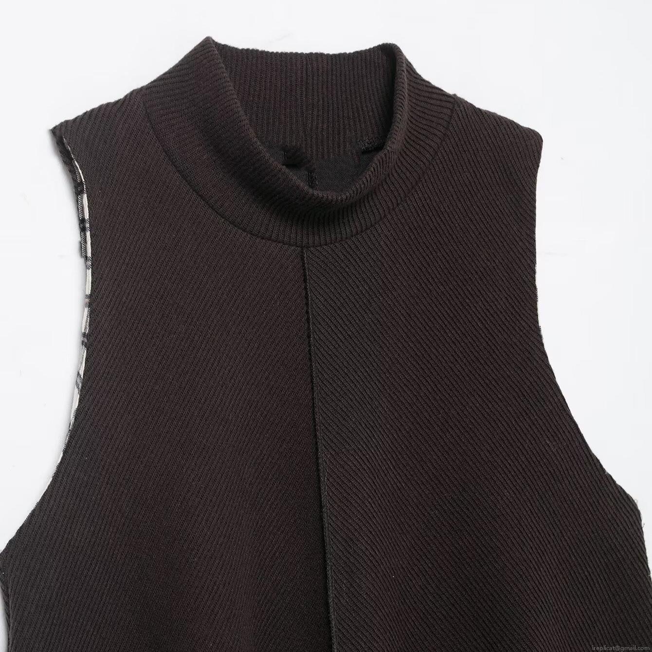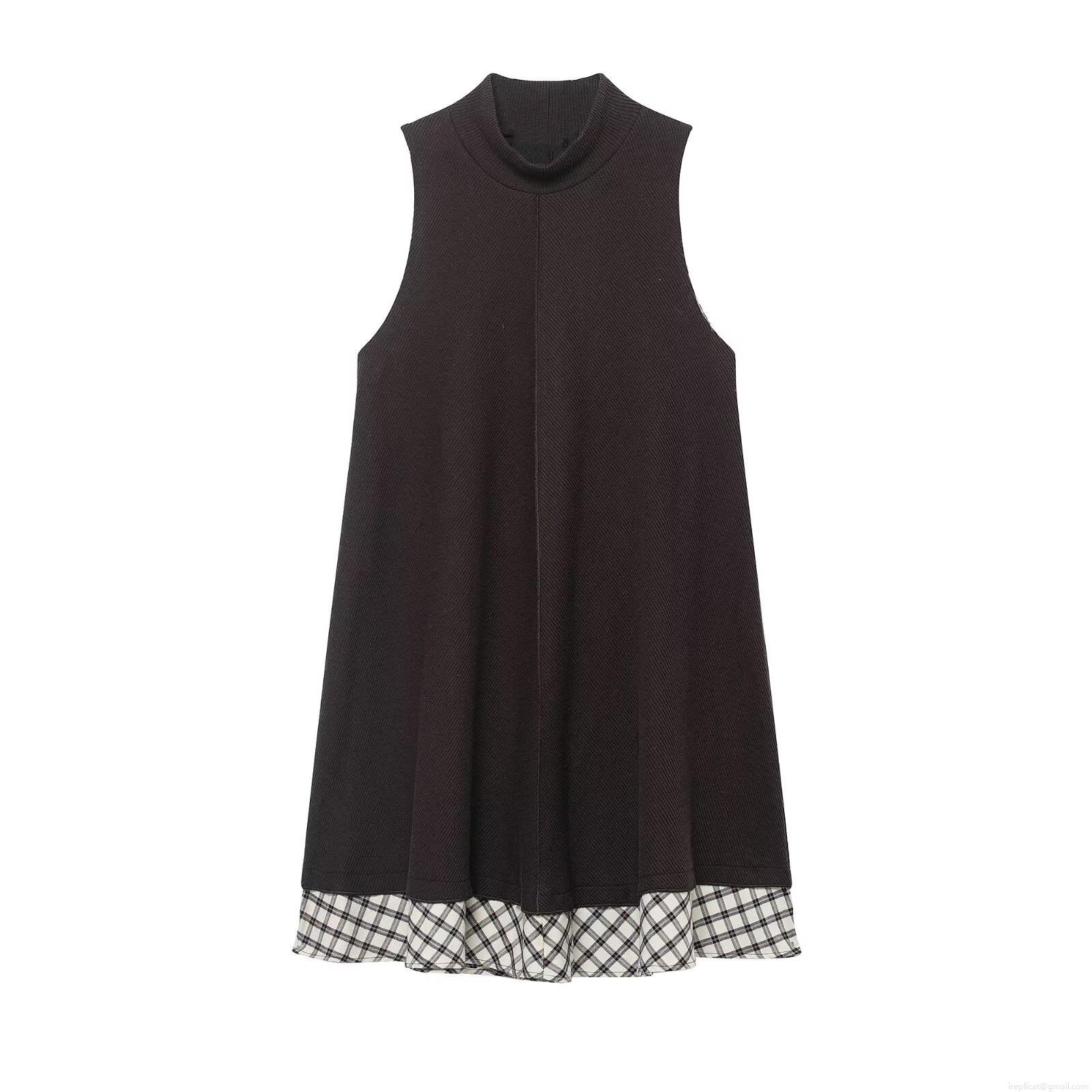 • Women's Casual Sleeveless Ribbed Knit Mini Dress With Gingham Patchwork Hem Fashion Stand Collar Loose A-Line Short Dress For Women Daily Wear