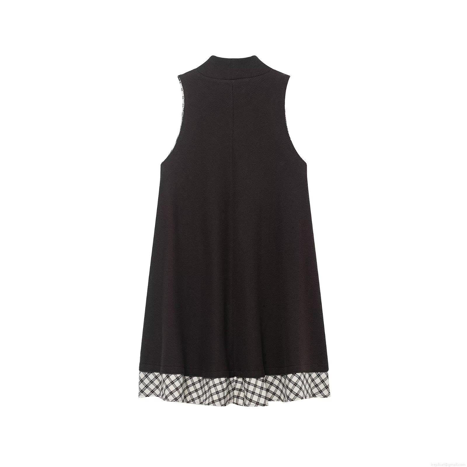 Women's Casual Sleeveless Ribbed Knit Mini Dress With Gingham Patchwork Hem Fashion Stand Collar Loose A-Line Short Dress For Women Daily Wear