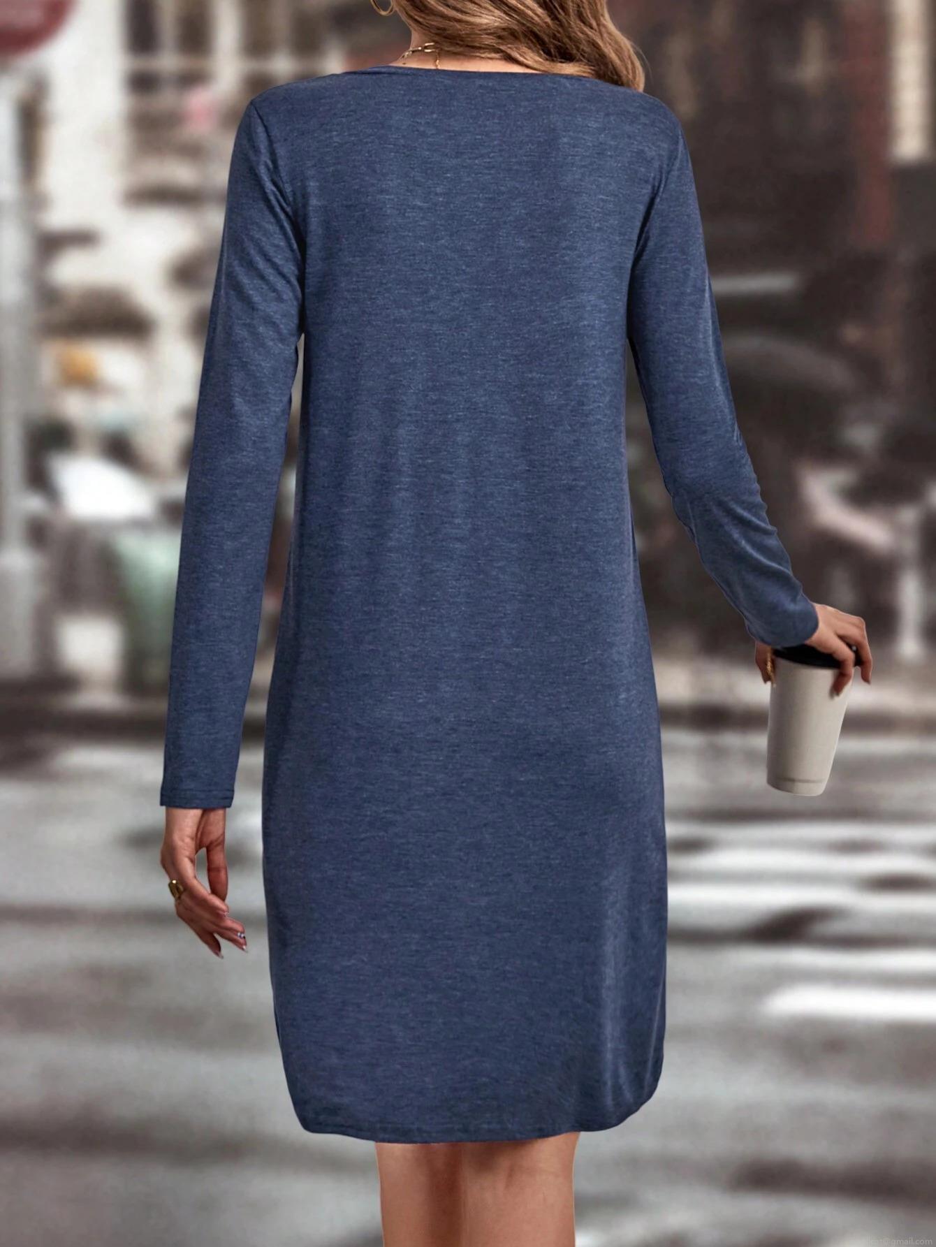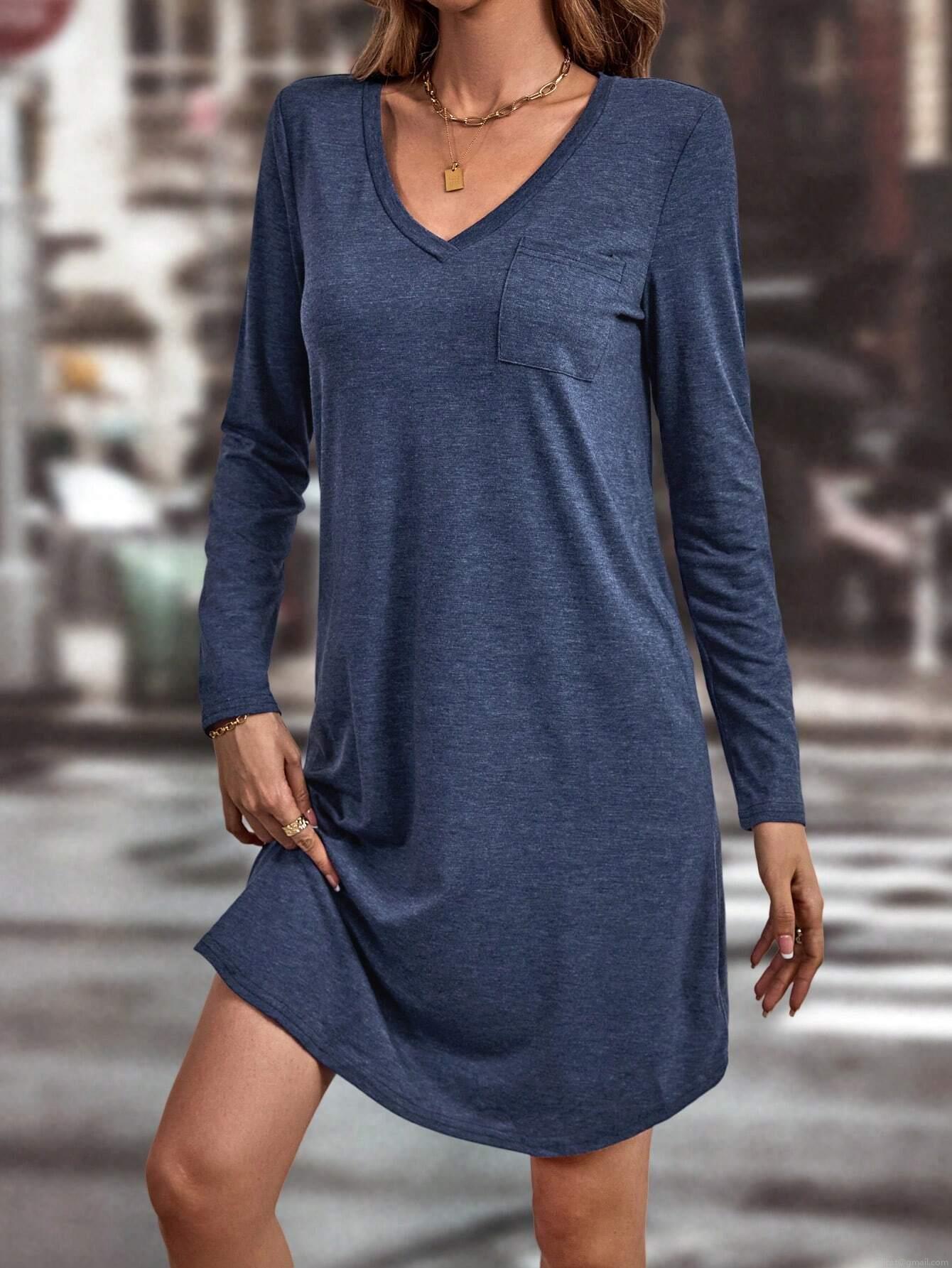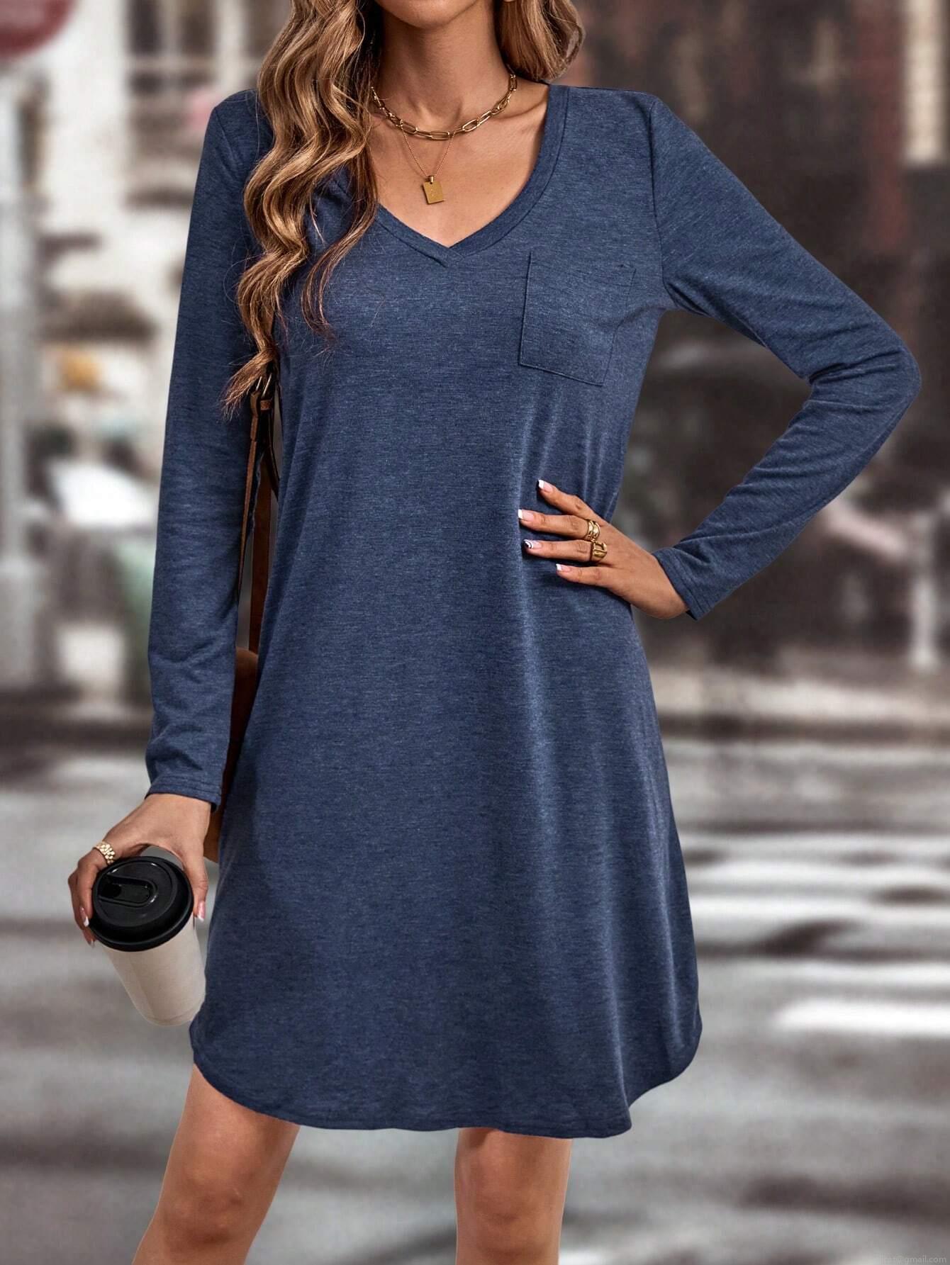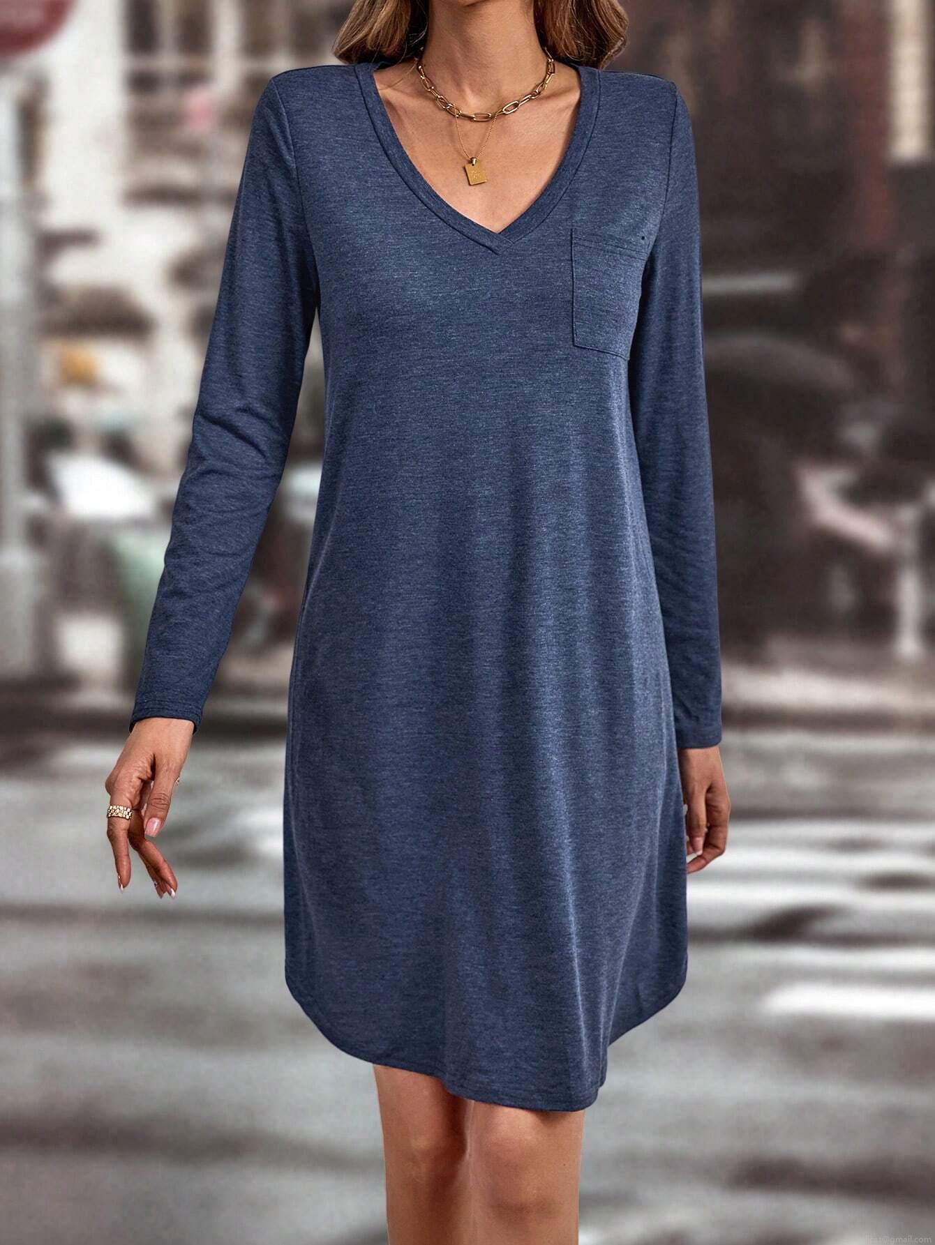 • Women's Casual V-Neck Long Sleeve Knit Dress With Pocket Polyester Viscose Elastane Solid Color A-Line Mini Dress Elegant Commute Dress