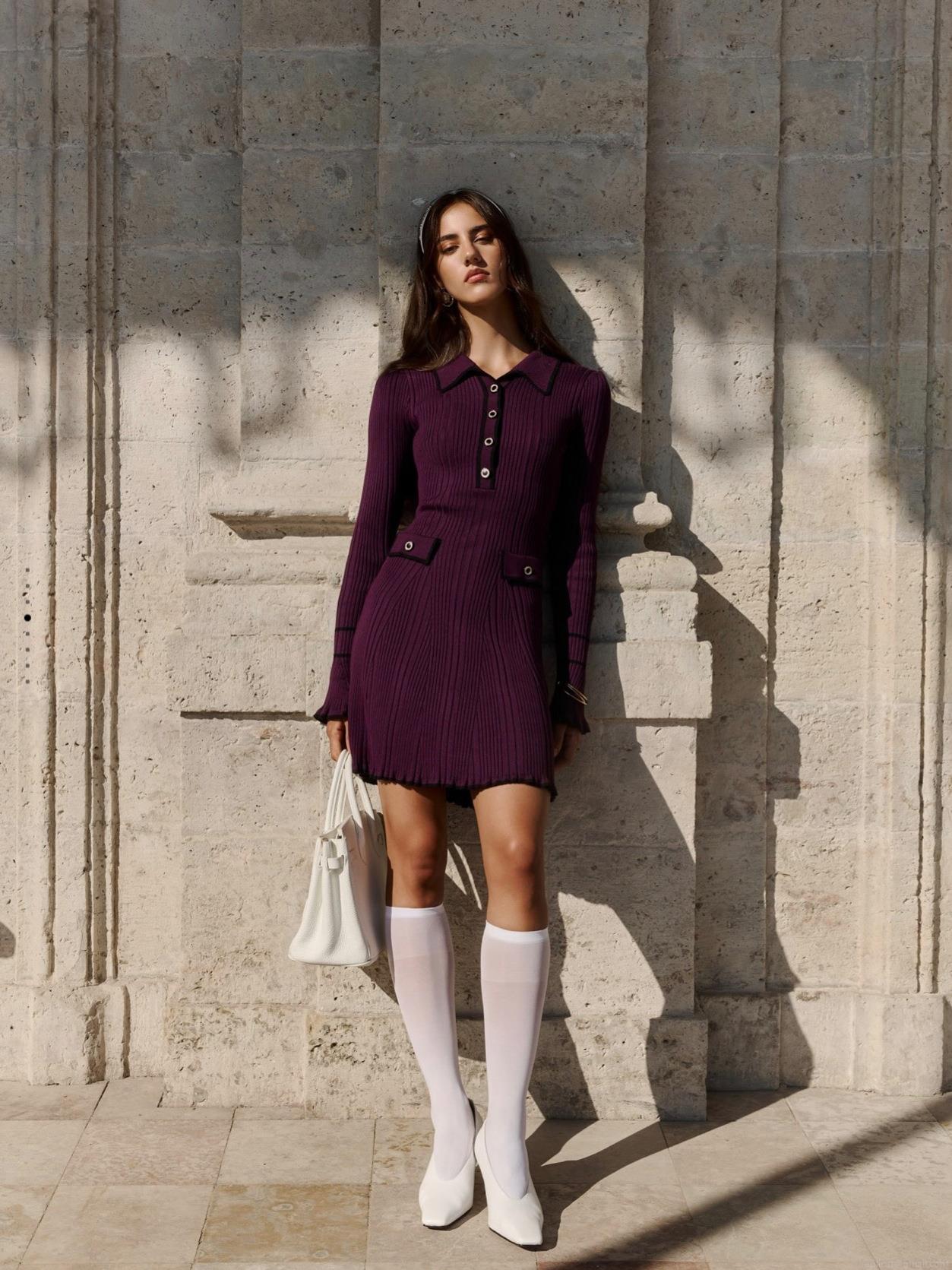 • Women's Cotton Blend Knit Polo Neck Mini Dress Long Sleeve Slim Fit Solid Color Ribbed Sweater Dress With Contrast Trim And Buttons For Party Dating