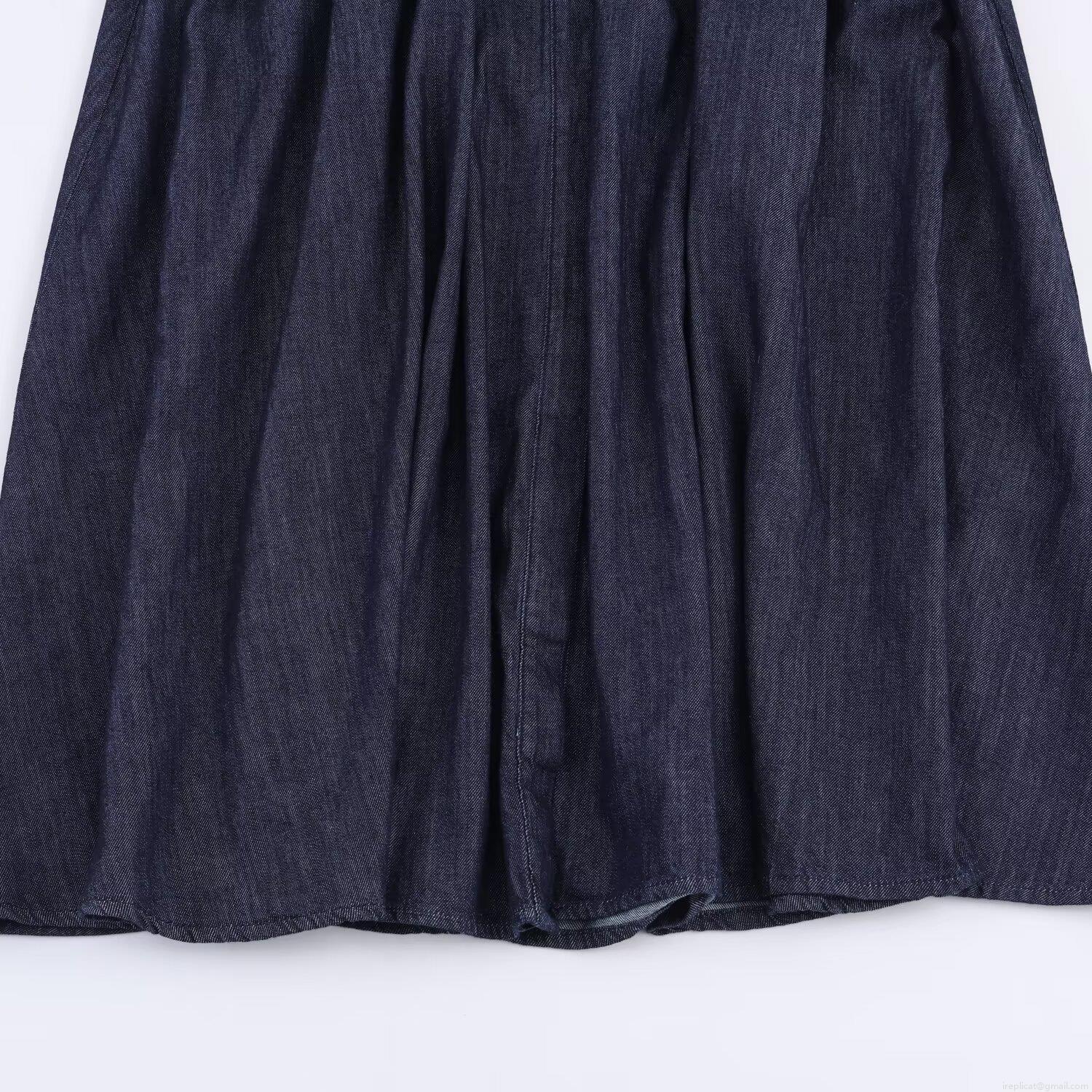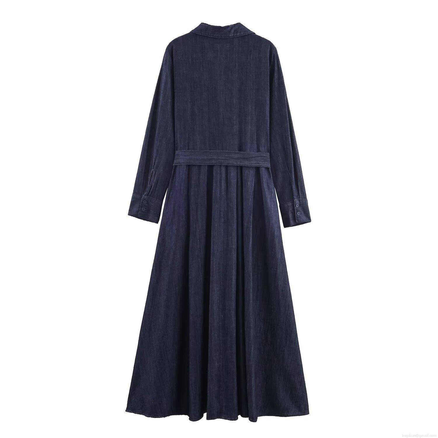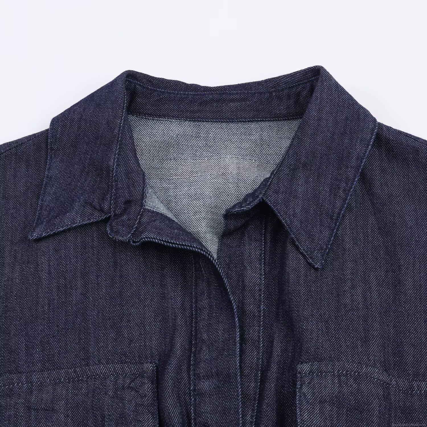 Women's Dark Blue Denim Long Sleeve Shirt Dress With Belt Lapel A-Line Mini Dress Cargo Pockets Street Style Autumn Jean Dress