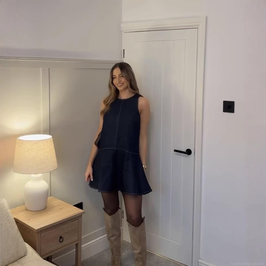 • Women's Dark Blue Sleeveless Denim-Like Polyester Mini Dress With Contrast Orange Topstitching Ruffle Hem Casual A-Line Round Neck Short Dress For Summer