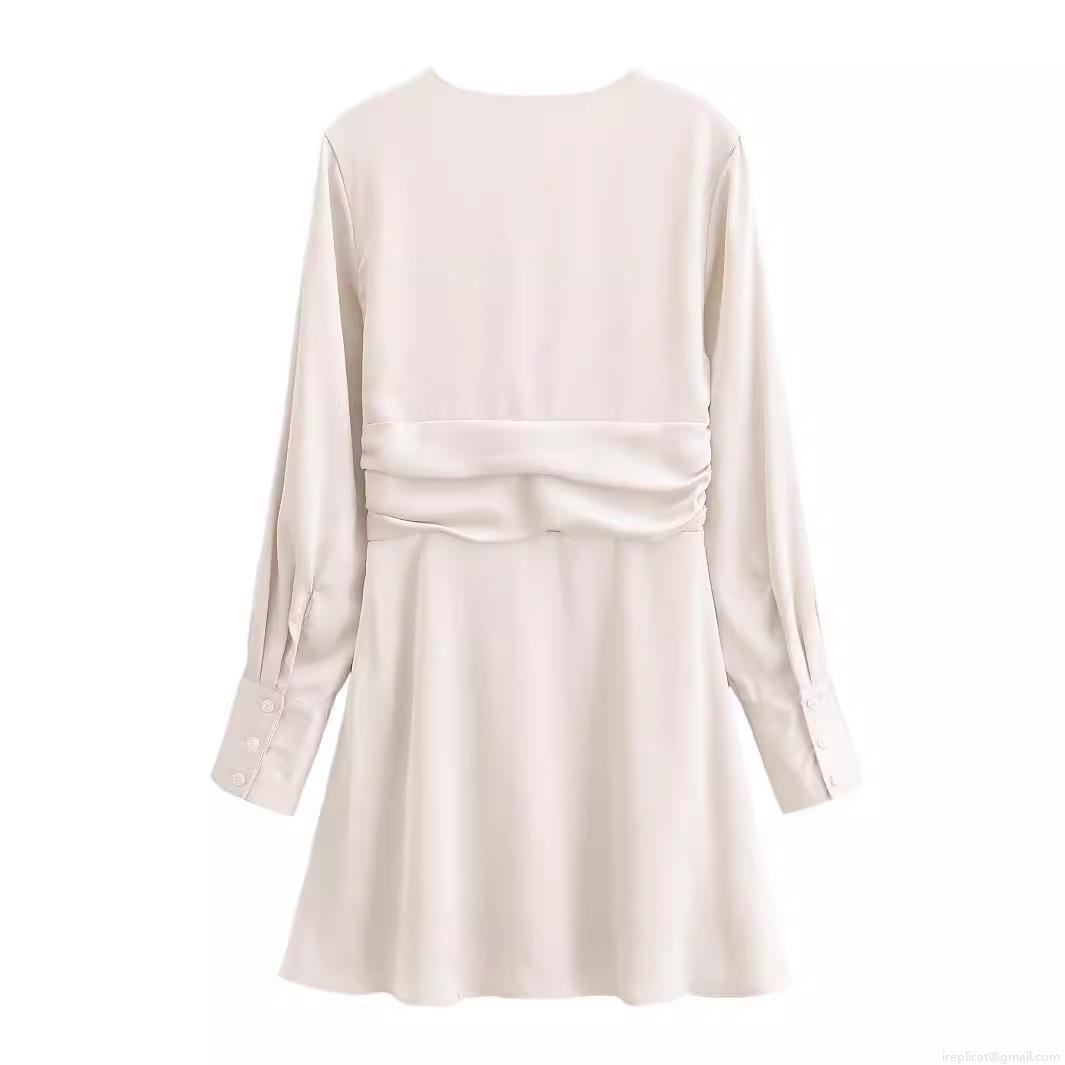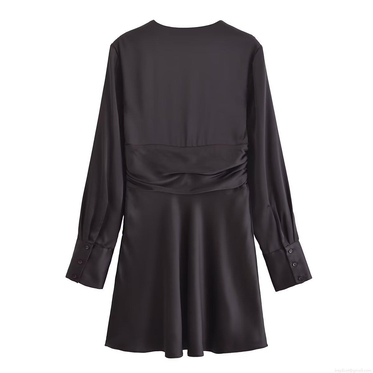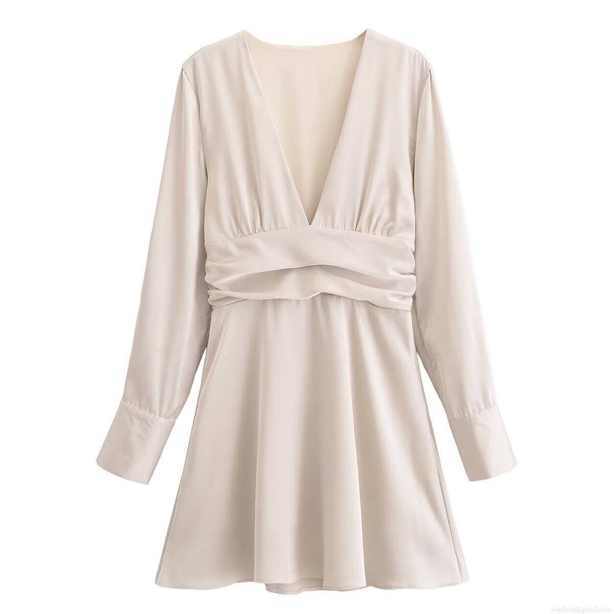 • Women's Deep V-Neck Long Sleeve Satin Mini Dress Elegant Ruched Waist Pleated A-Line Solid Color Short Dress For Party Evening Club Ladies Autumn Fashion