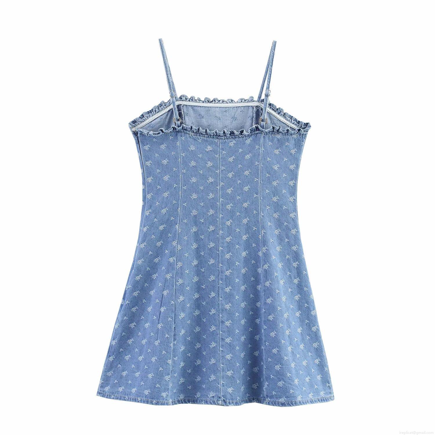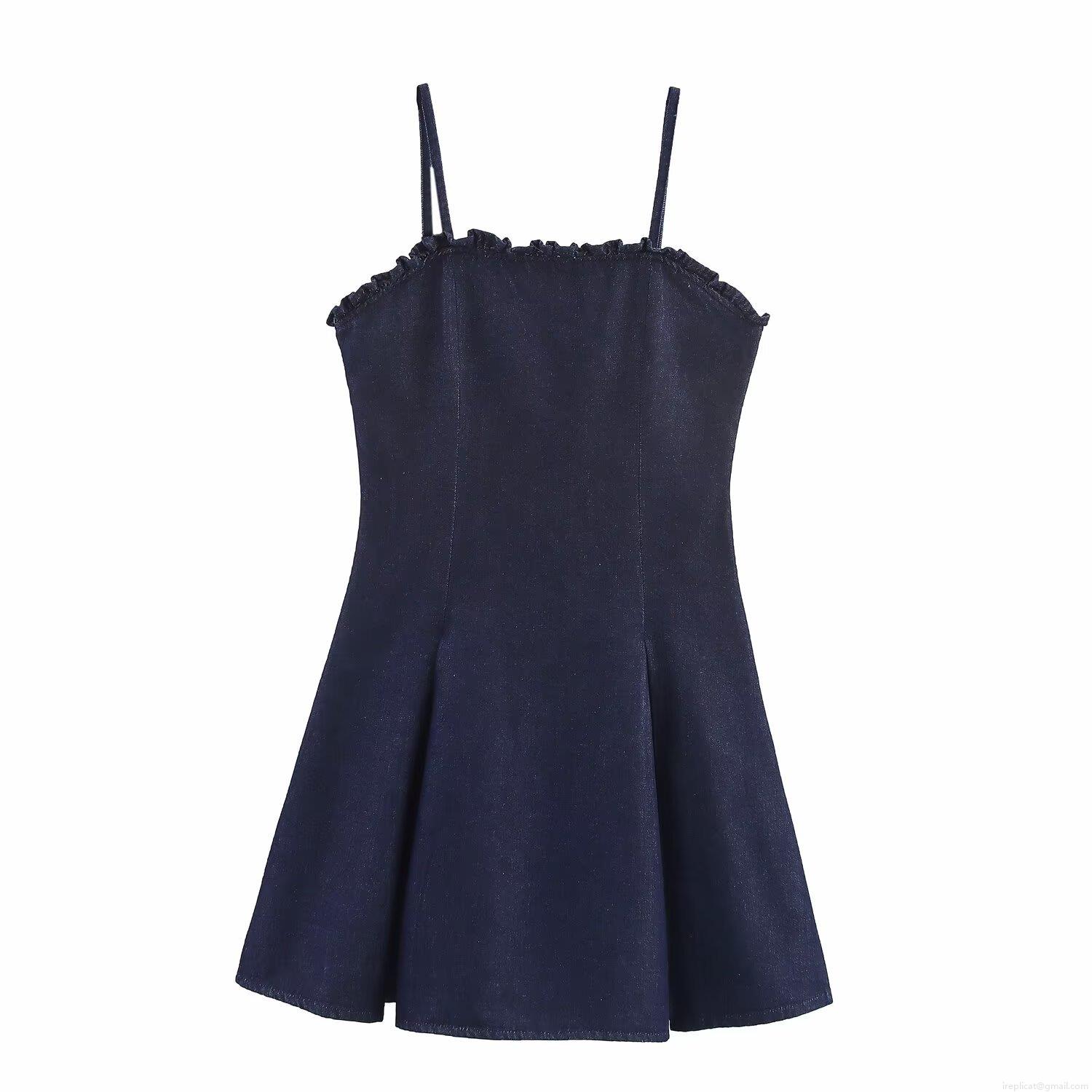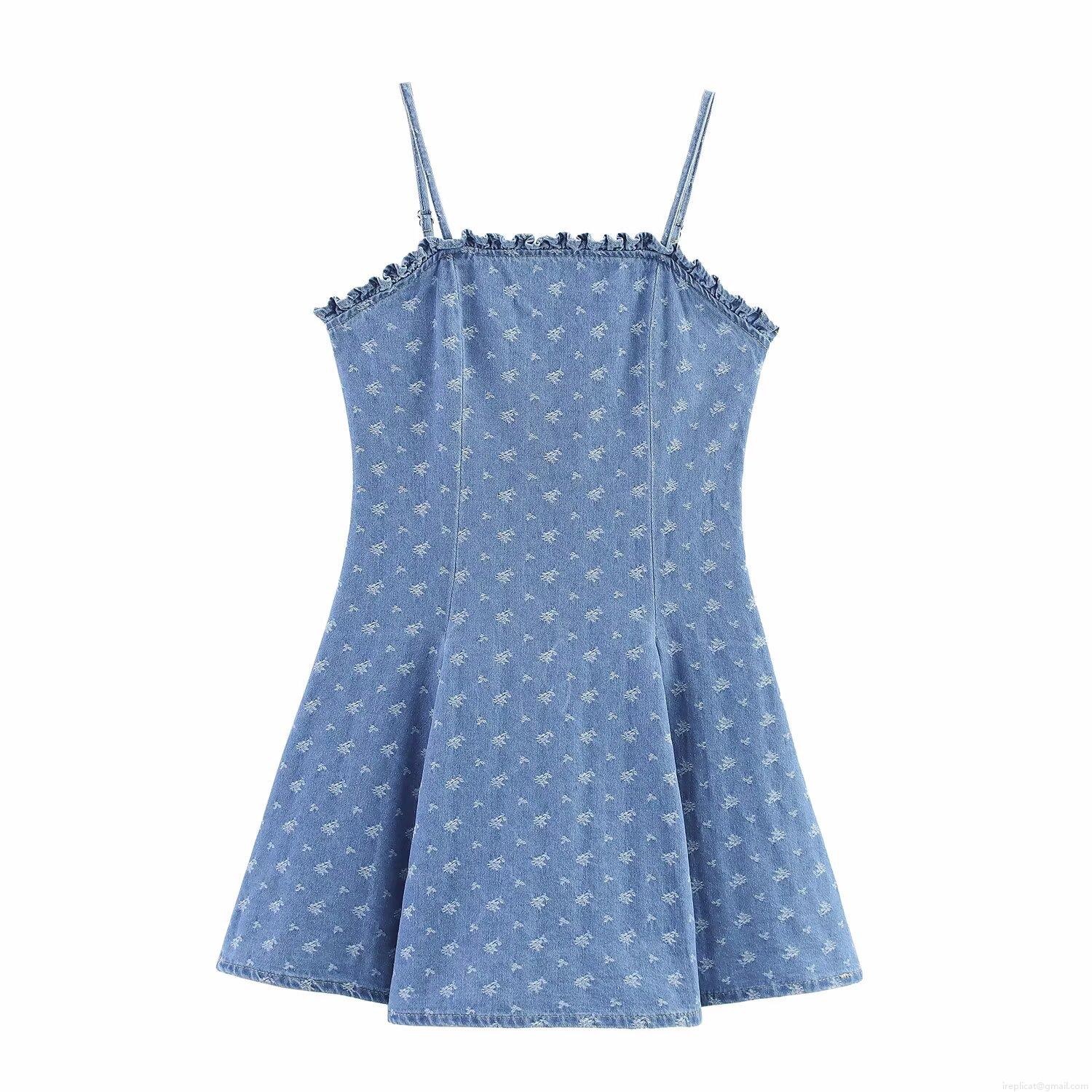 • Women's Denim Cami Mini Dress Adjustable Strap Ruffle Trim Floral Solid A-Line Sundress For Summer Casual Party Elegant Ladies Dress