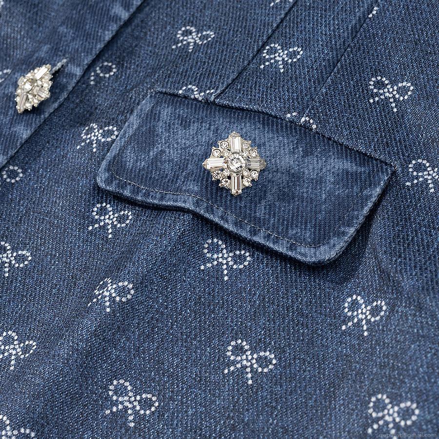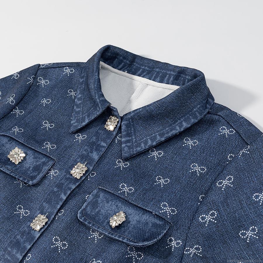 Women's Denim Style Short Sleeve Dress Bow Knot Print Lapel Mini Dress With Rhinestone Buttons Western Slim Fit Summer Autumn Dress