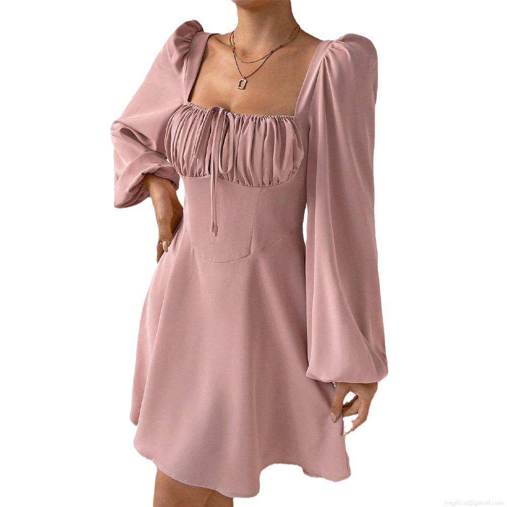 • Women's Elegant 100% Polyester Square Neck Puff Sleeve Mini Dress Sweet Waist-Nipping A-Line Pink Pleated Party Dress for Women