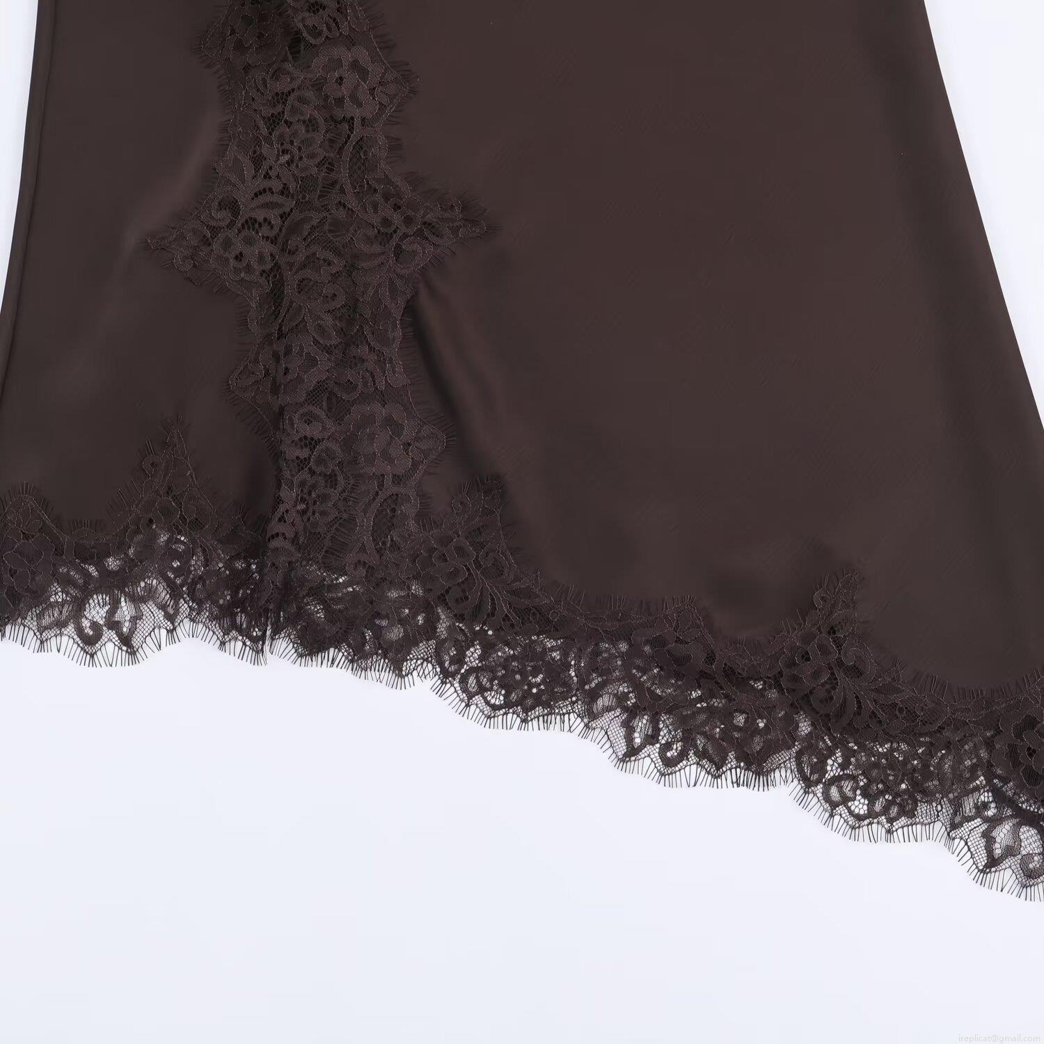 • Women's Elegant Brown Satin Cami Mini Dress With V-Neck Lace Trim Asymmetric Hem Luxury Silk Texture Party Dress Bodycon Slip Dress For Wedding Evening