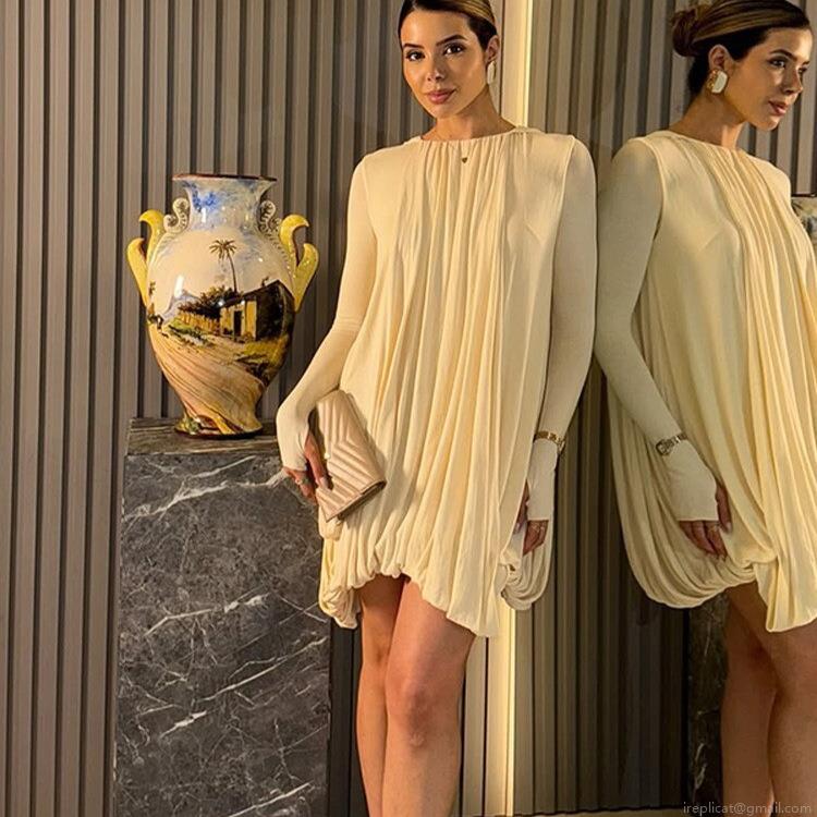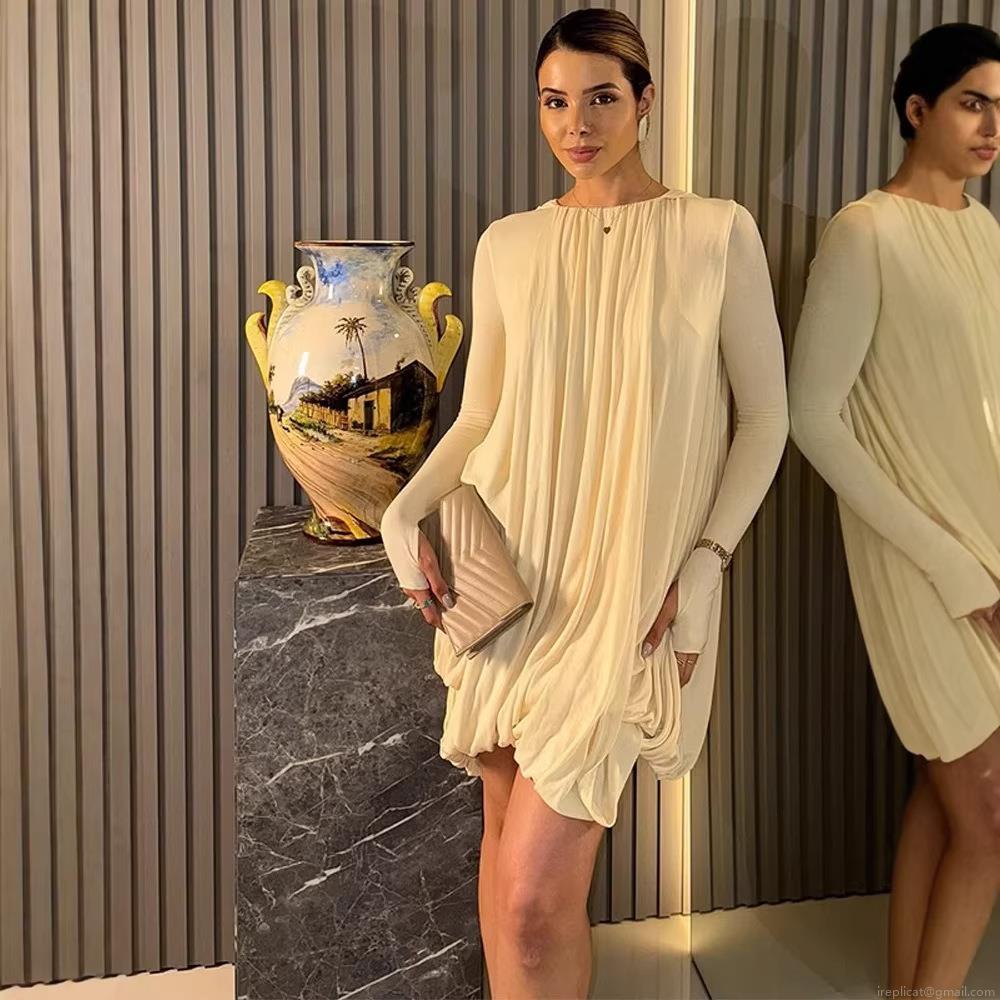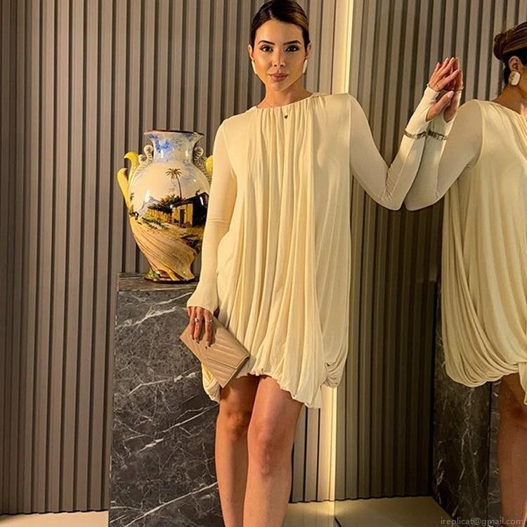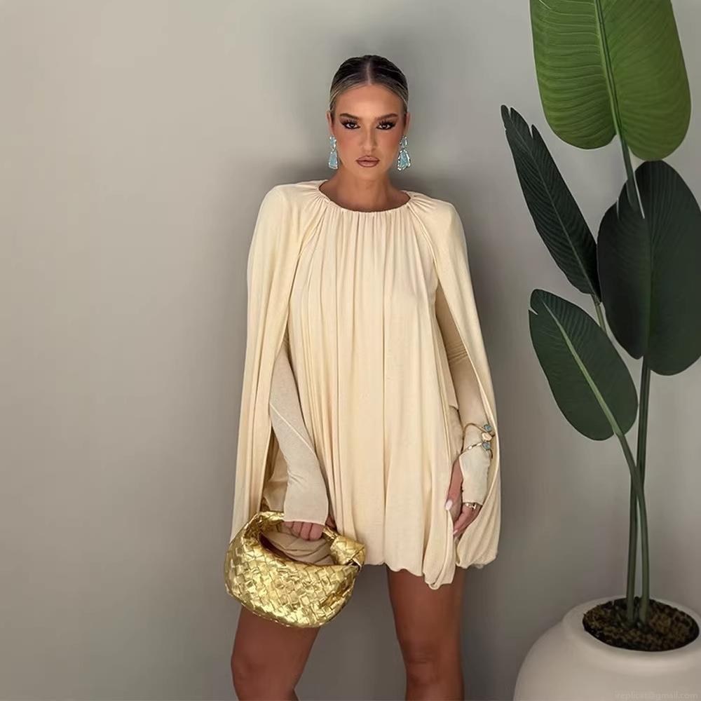 • Women's Elegant Cape Style Pleated Mini Dress Loose Fit Round Neck Lantern Sleeve Cocktail Party Dress Luxury Celebrity Style Short Dress For Women Banquet Off White