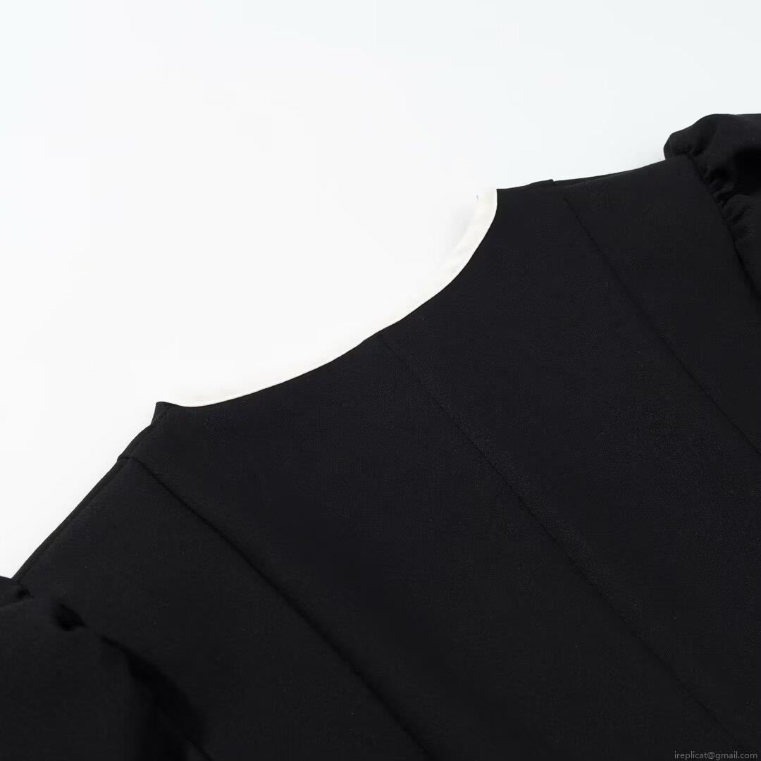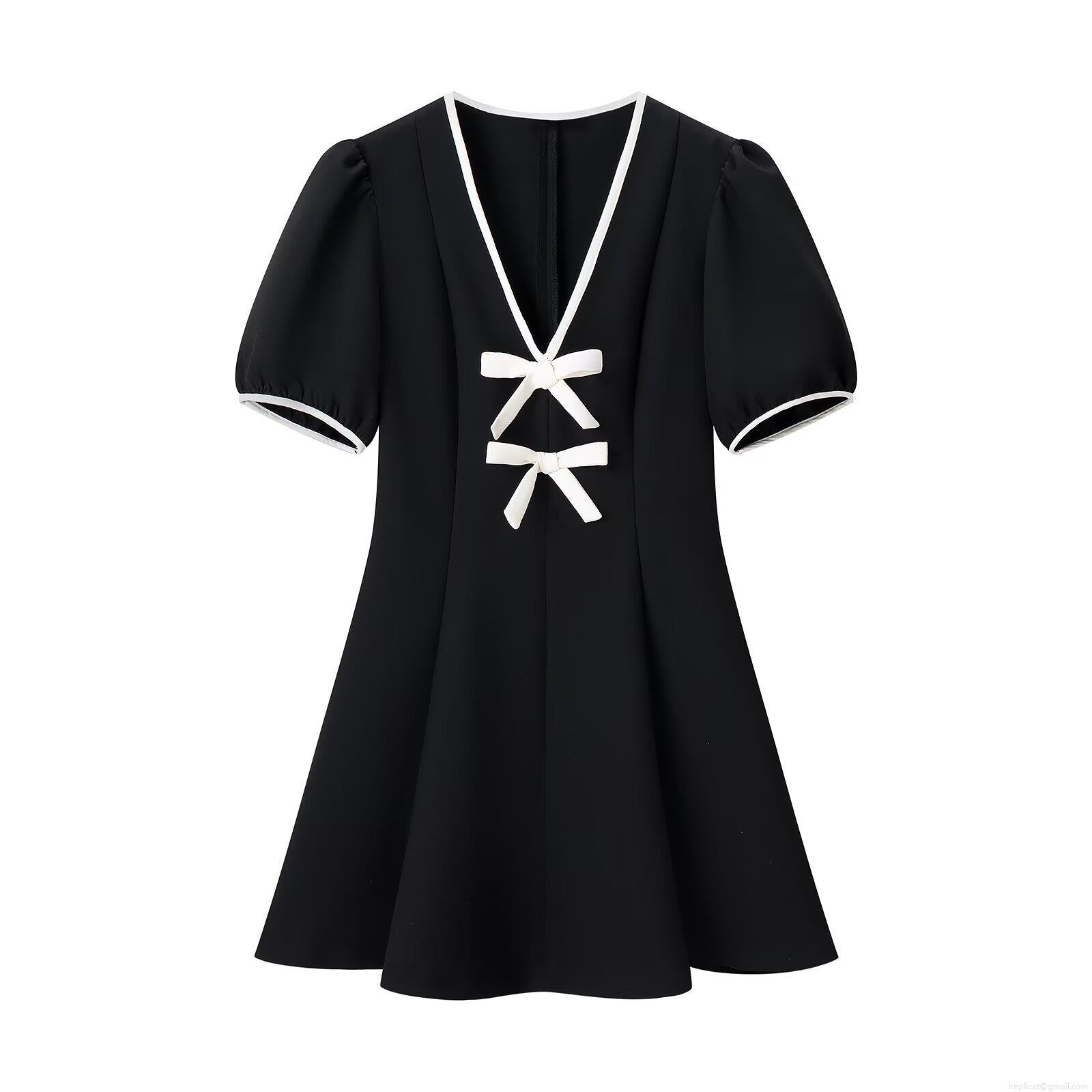 • Women's Elegant Contrast Color Bow Tie Mini Dress Summer V-Neck Puff Short Sleeve A-Line Woven Dress for Casual Party Date