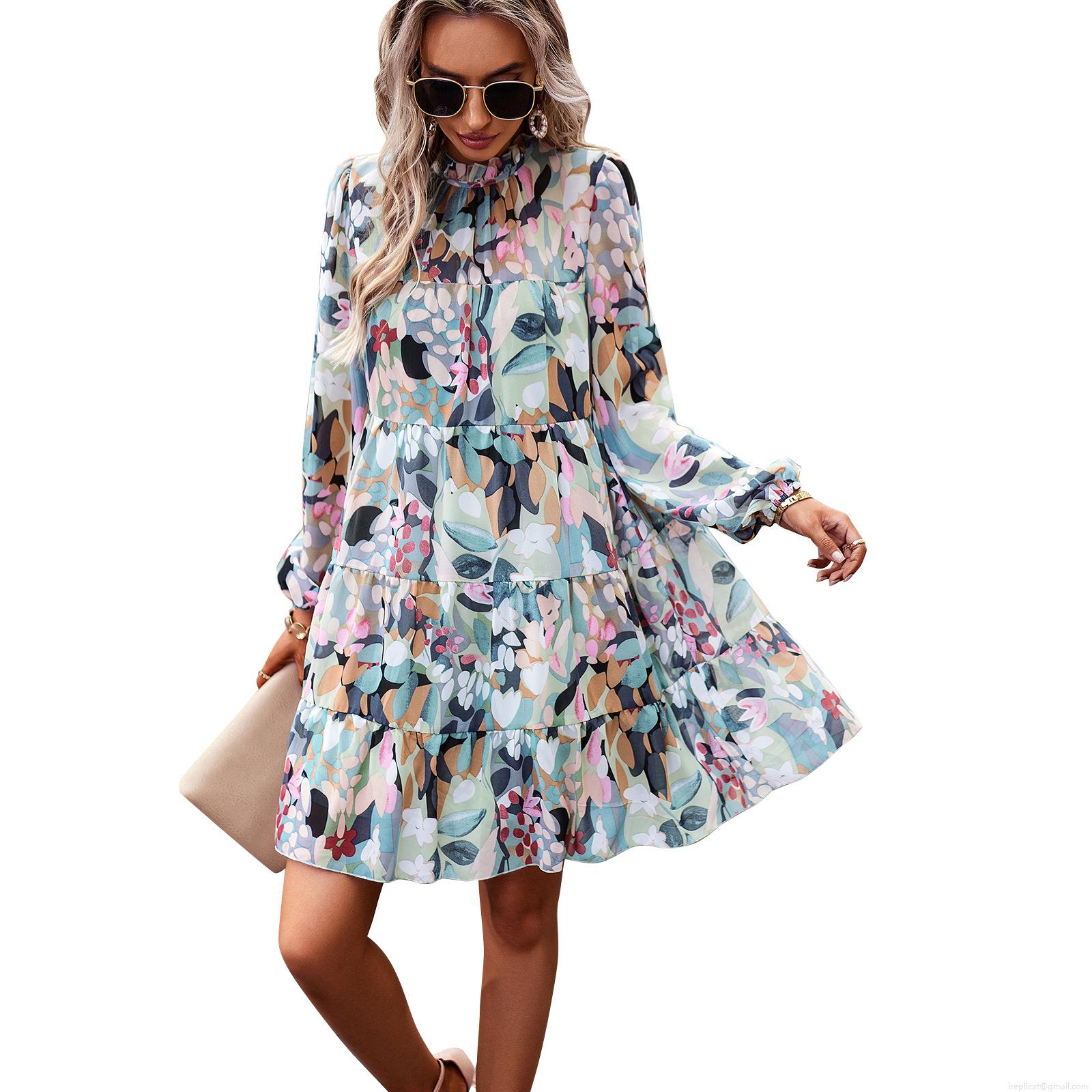 • Women's Elegant Floral Geometric Print Dress Long Puff Sleeve Ruffle Hem Tiered A-Line Mini Dress With Back Tie High Neck Autumn Winter Fashion Ladies Boho Party Wear