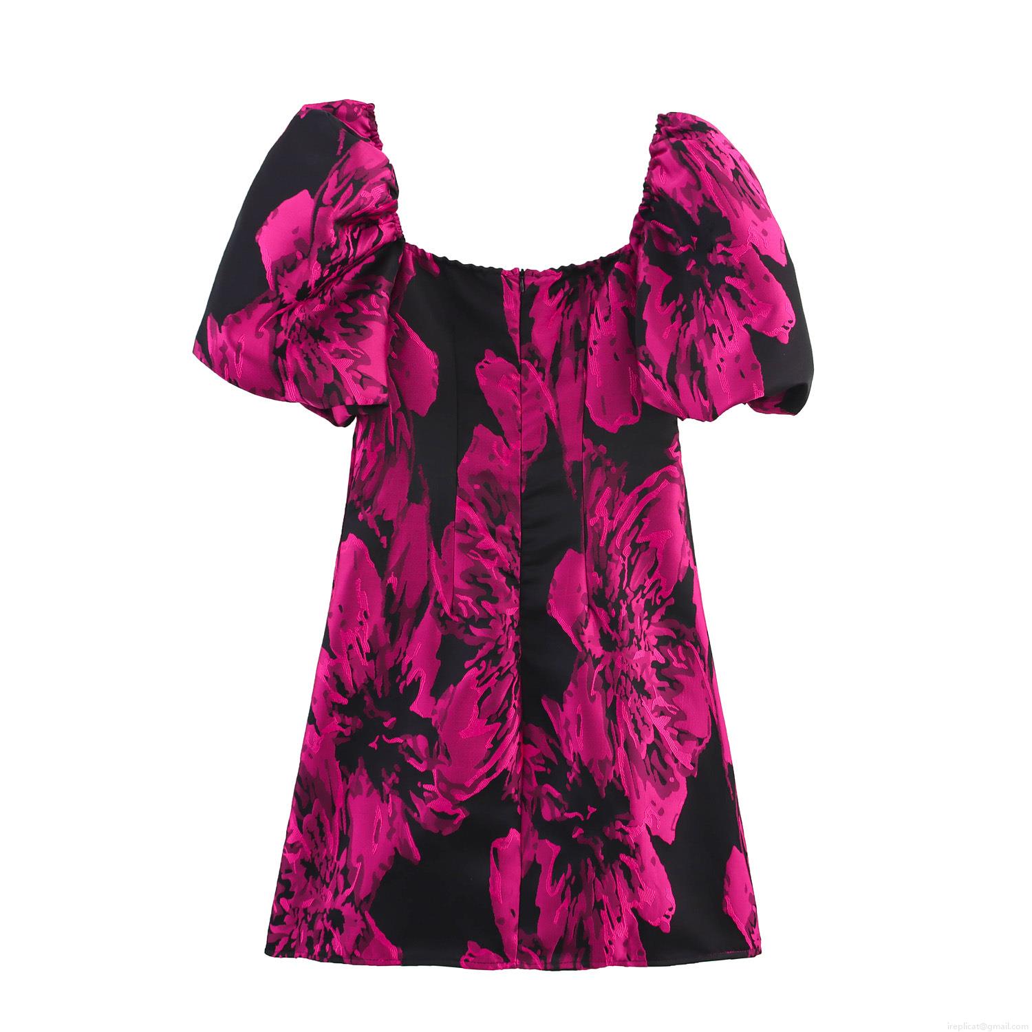 • Women's Elegant Floral Jacquard Mini Dress Vintage Square Neck Puff Sleeve Short Dress Evening Party A-Line Fashion Summer Floral Dress For Women