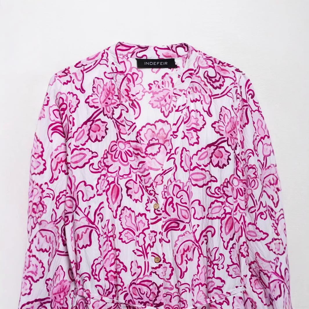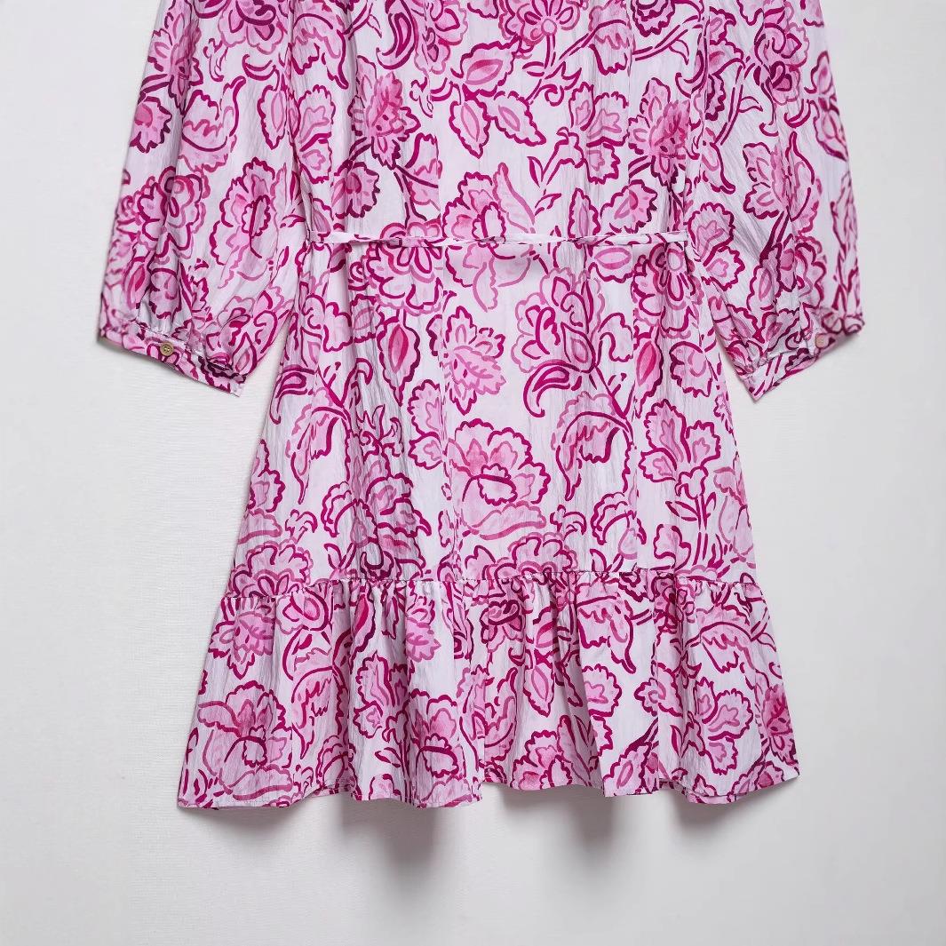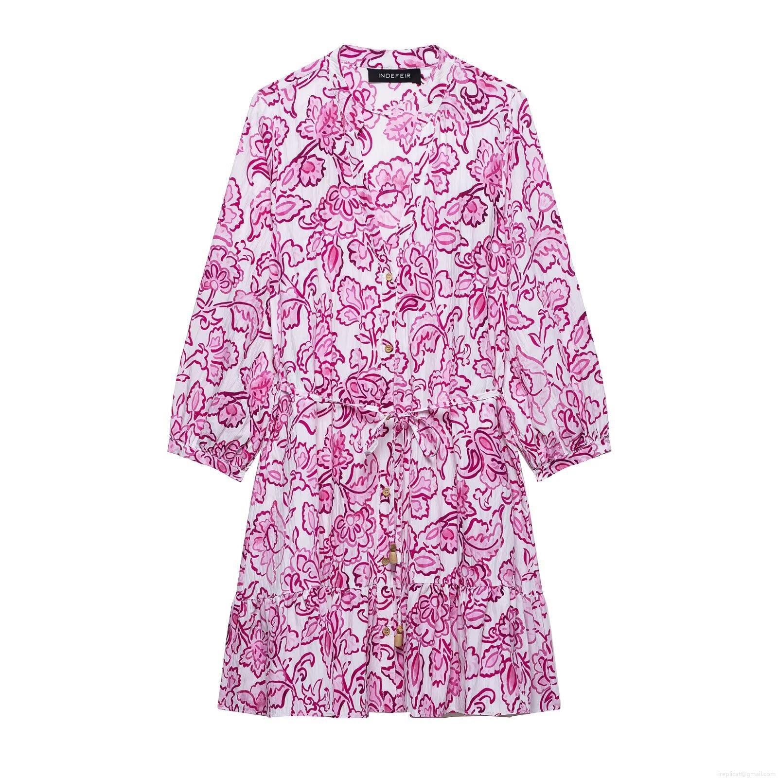 • Women's Elegant Floral Print Mini Dress V-Neck Button Down Long Sleeve Ruffle Hem Dress With Drawstring Tie Waist Polyester Crepe Beach Vacation Dress