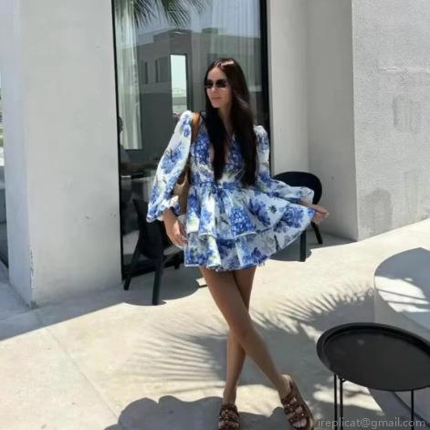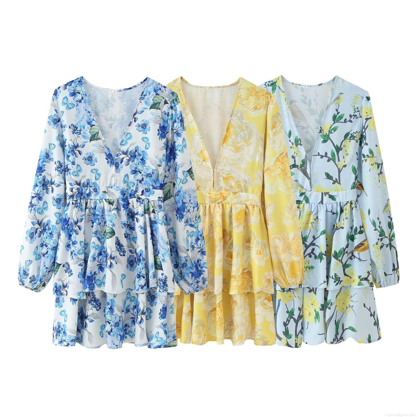 Floral Pattern, Ruffles, V-neck, Puff Sleeves, Layered Skirt, Floral And Bird Print