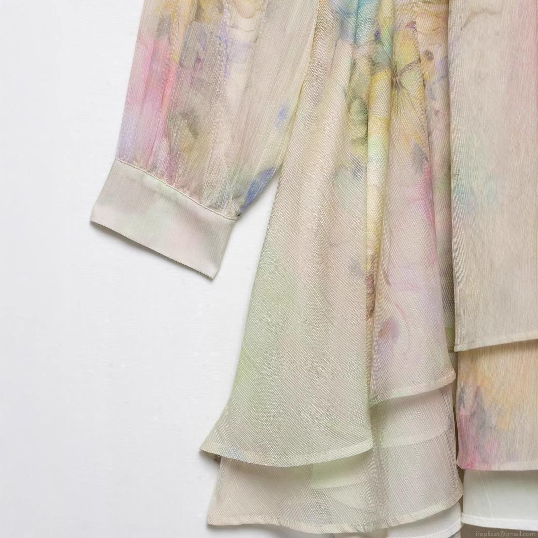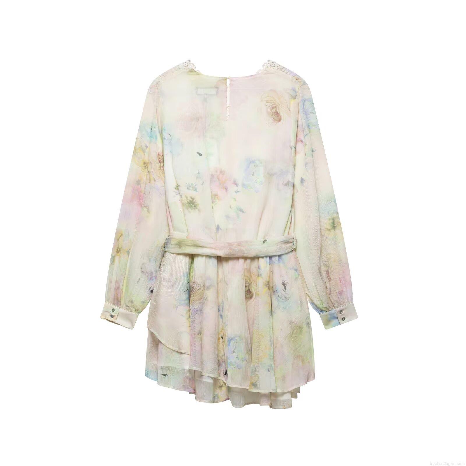 • Women's Elegant Floral Printed Chiffon Dress Long Sleeve Lace Patchwork Tiered Hem Dress With Waist Tie Bow Bohemian Spring Mini Dress