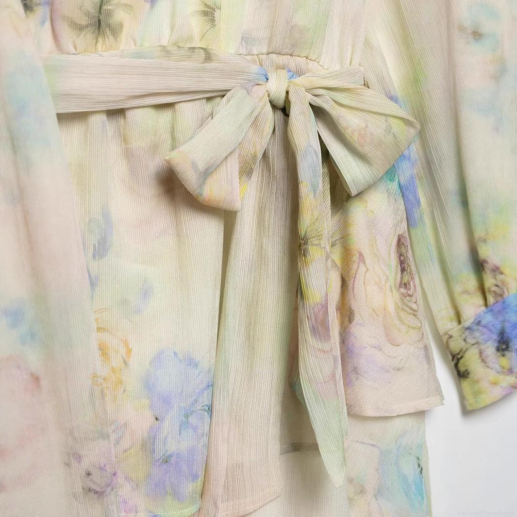 Women's Elegant Floral Printed Chiffon Dress Long Sleeve Lace Patchwork Tiered Hem Dress With Waist Tie Bow Bohemian Spring Mini Dress