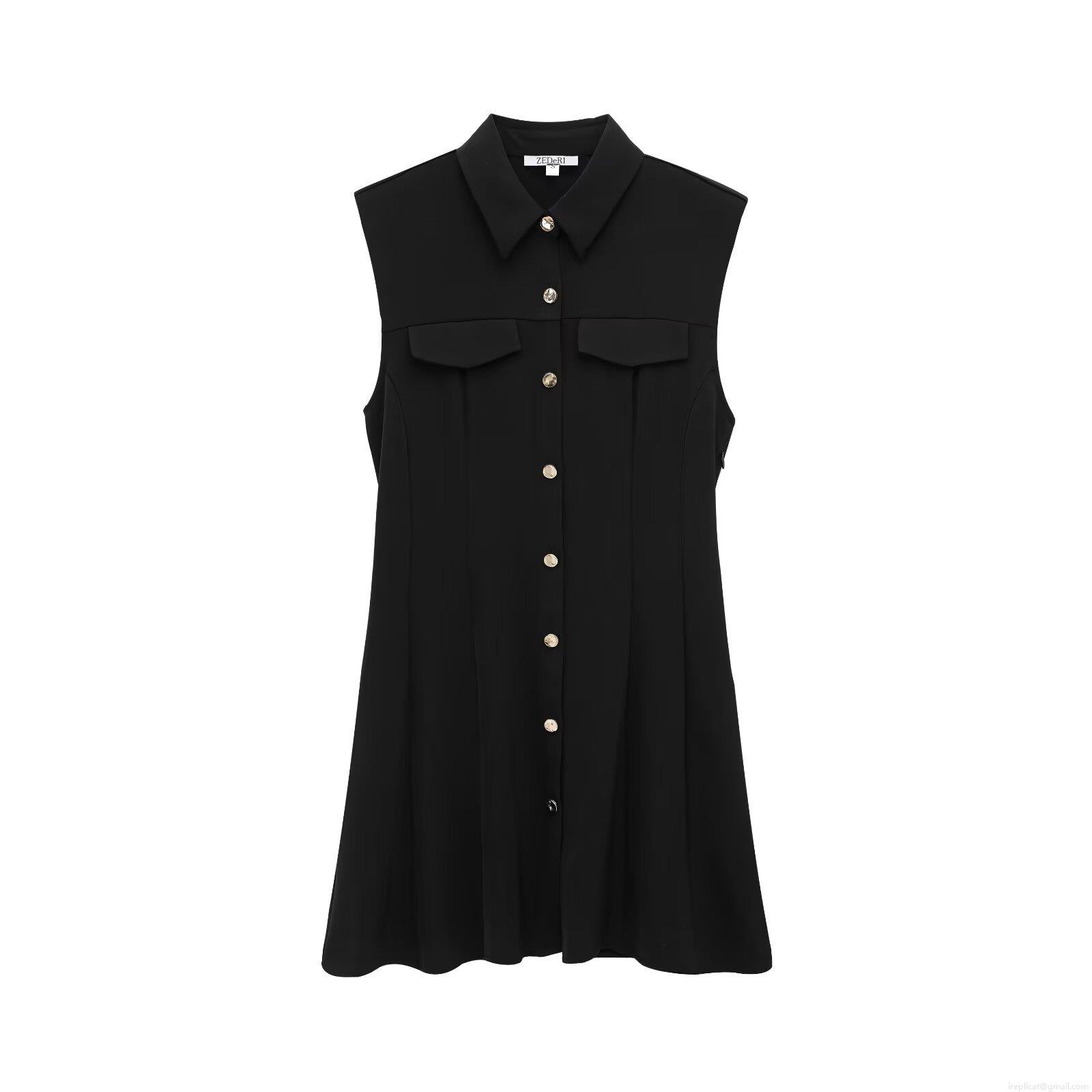 • Women's Elegant French Style Sleeveless Shirt Dress Solid Color Button Down Mini Dress with Pockets for Office Lady Spring Summer