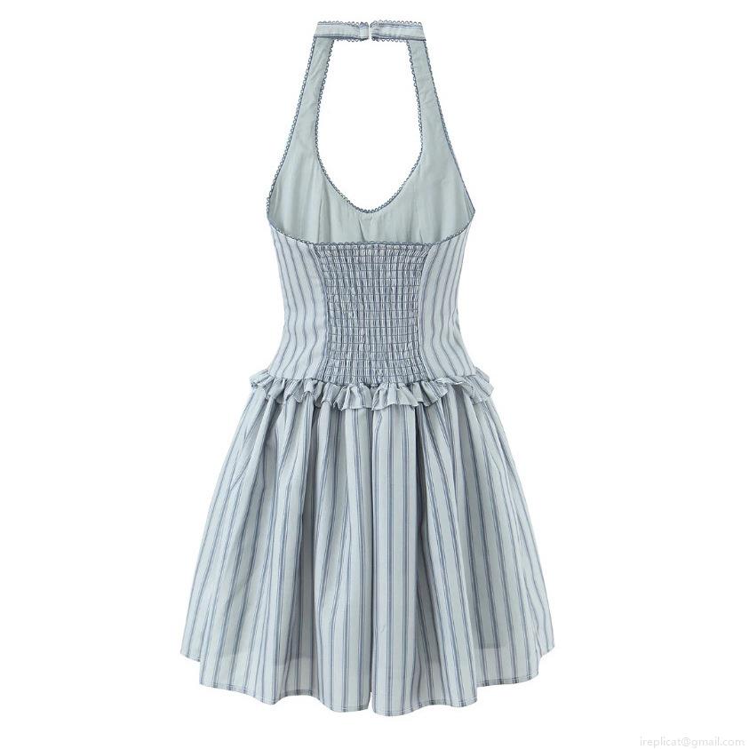 • Women's Elegant Halterneck Striped Mini Dress With Bow Decoration Ruffle Hem Back Smocking Sleeveless Summer Party Vacation Sundress
