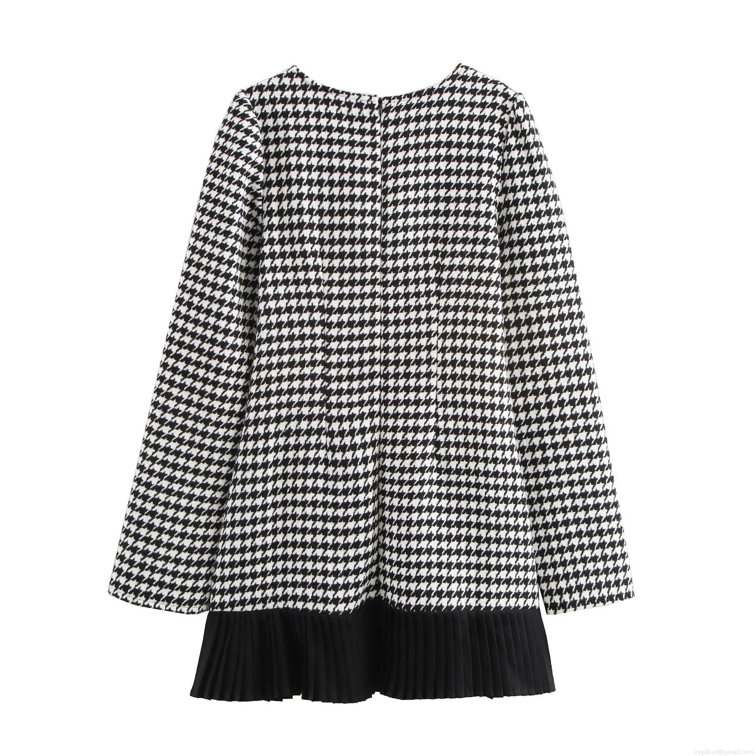 • Women's Elegant Houndstooth Tweed Patchwork Mini Dress Long Sleeve Round Neck A-Line Pleated Hem Short Skirt With Gold Buttons For Fall Winter Party Formal Event Office Lady Outfit