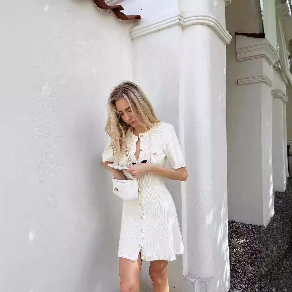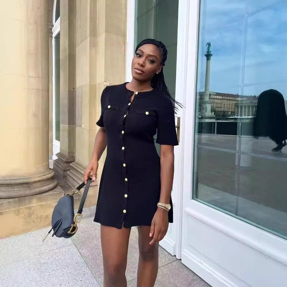 • Women's Elegant Knit Mini Dress Chanel Style Short Sleeve Round Neck Single Breasted Gold Button Solid Color Slim Fit Fashion Lady Short Skirt
