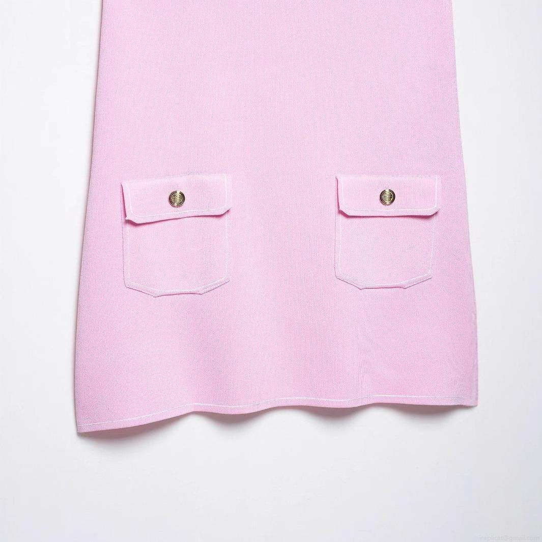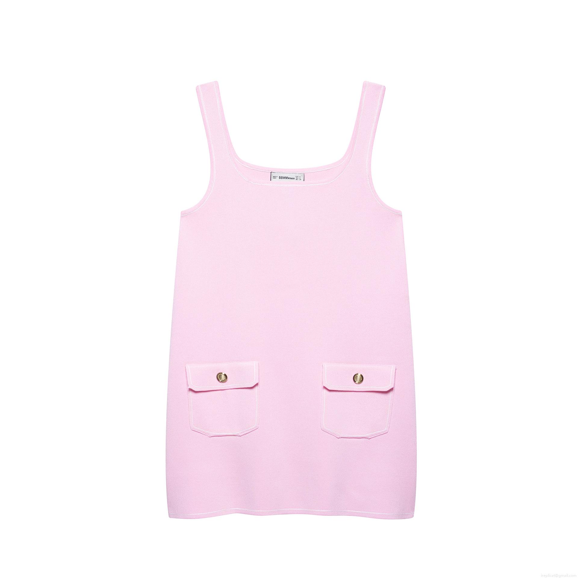 Women's Elegant Knitted Mini Dress Square Neck Sleeveless Backless Solid Pink Sundress With Gold Buttons And Pockets For Summer Party Date Night Fashion Clothing