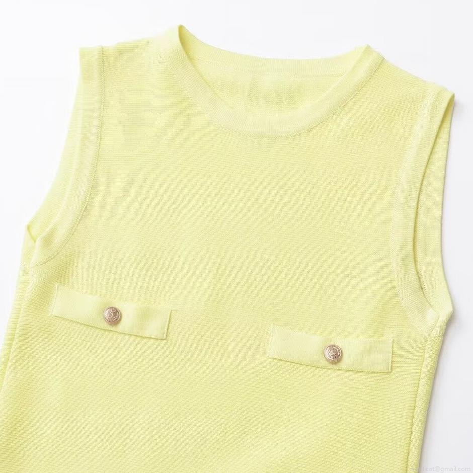 • Women's Elegant Knitted Sleeveless Mini Dress Mercerized Cotton Blend Pleated Hem Sweet Style Celebrity Dress With Gold Buttons And Decorative Pockets