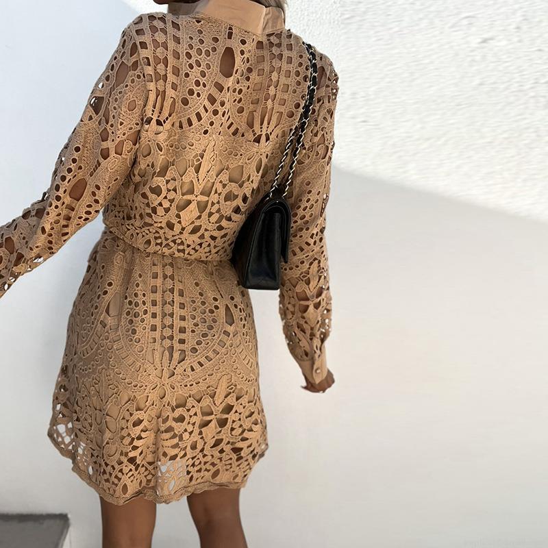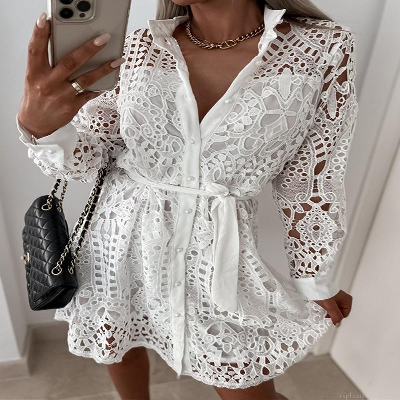 • Women's Elegant Lace Hollow Out Mini Shirt Dress Long Sleeve Single Breasted Button Down Party Vacation Commute Dresses With Belt