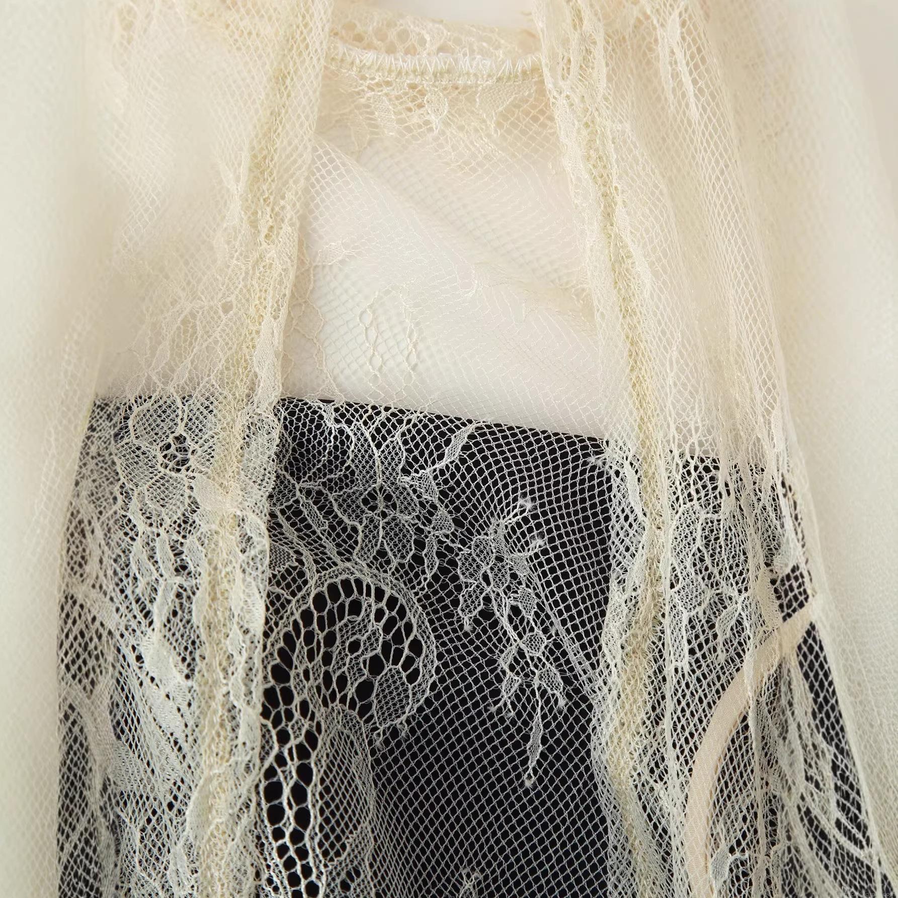 Hollow Out, Color Blocking, Backless, Lace Patchwork, Stand-up Collar, Bell Sleeves, Floral Lace