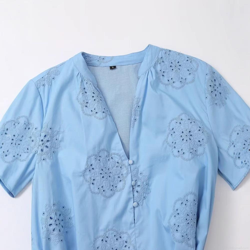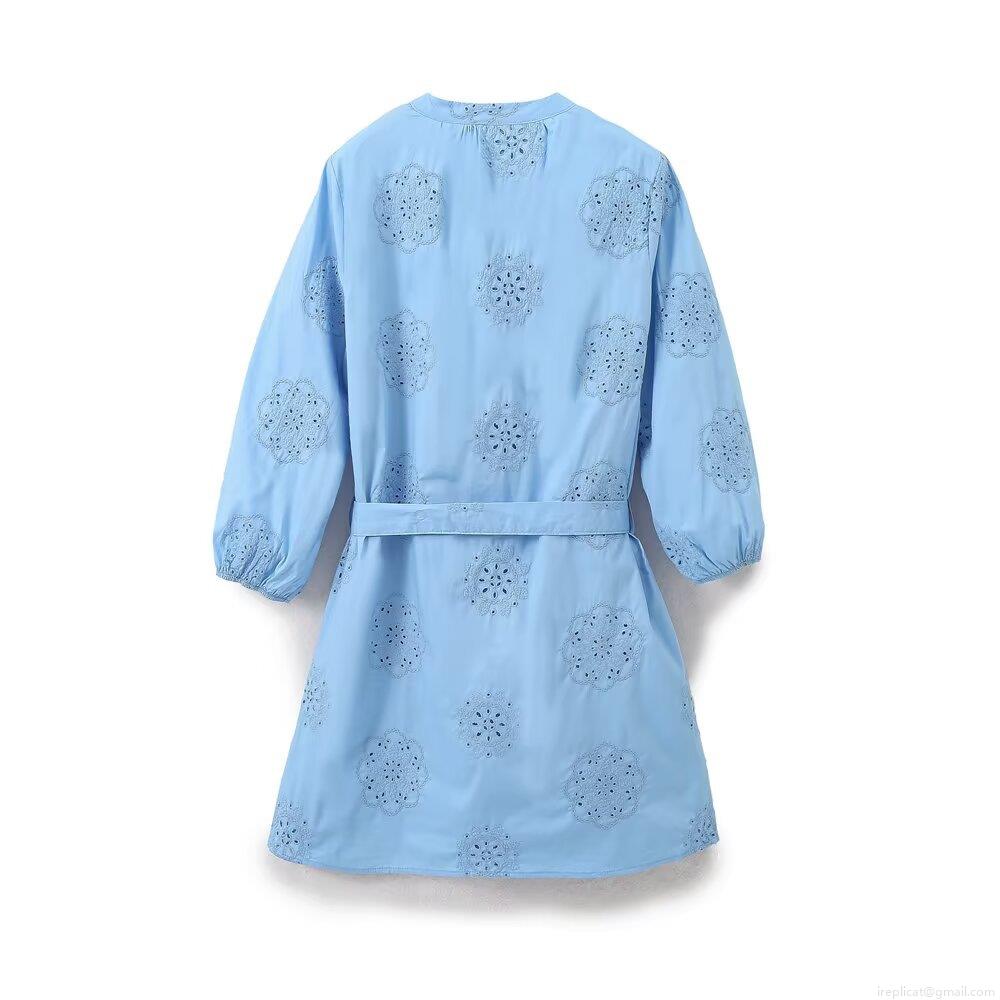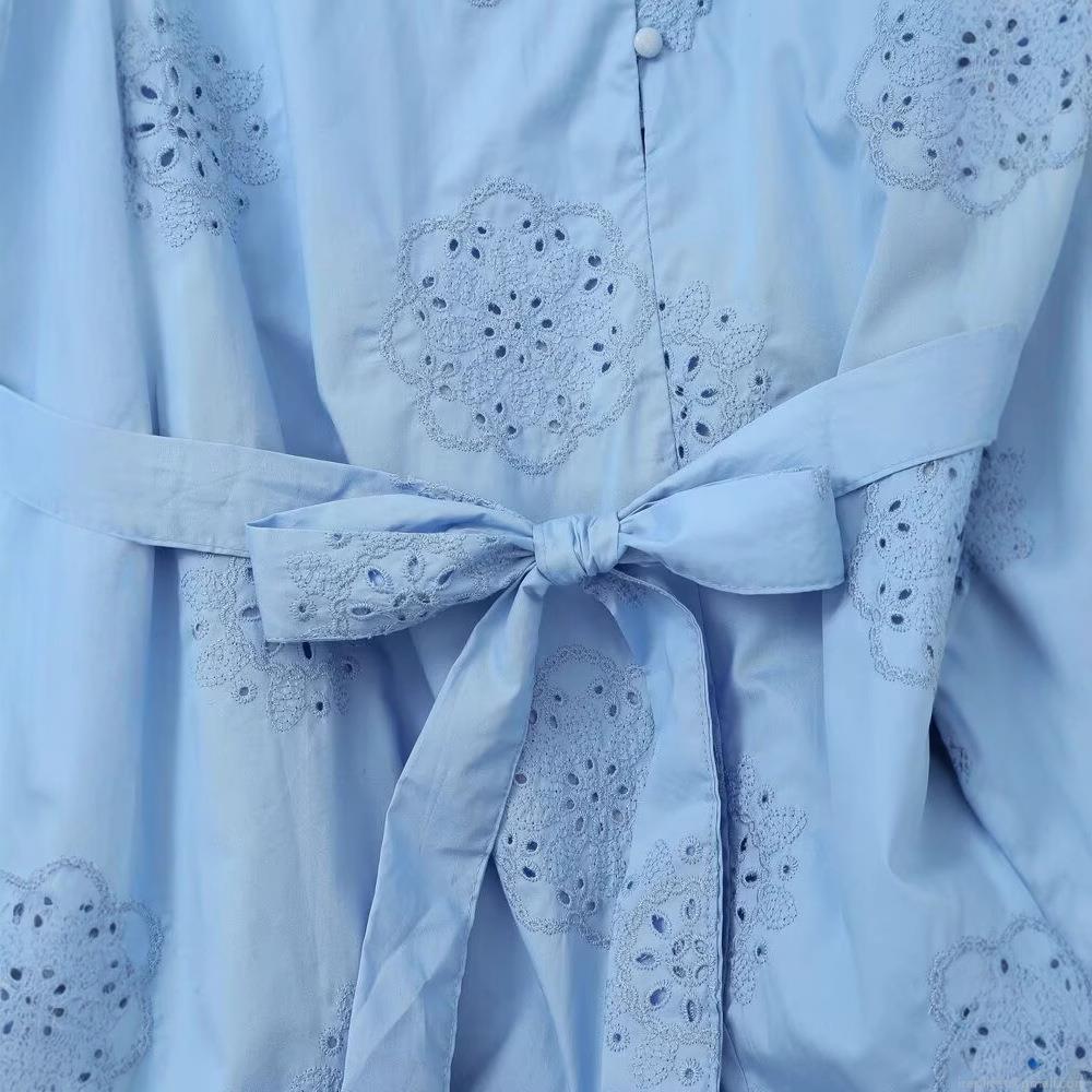 • Women's Elegant Light Blue Embroidery Poplin V-Neck Mini Dress Long Sleeve Hollow Out Casual A-Line Dress With Belt For Summer Autumn Cotton Blend